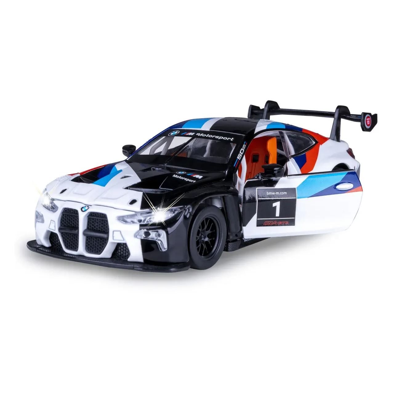 Der BMW M4 GT3 ist ein reinrassiger Rennwagen, der für den weltweiten Einsatz im GT3-Motorsport entwickelt wurde und auf dem Serienmodell M4 basiert. Mit einem leistungsstarken Reihensechszylinder-Motor, ausgefeilter Aerodynamik und modernster Renntechnik repräsentiert er die Spitze der BMW M Motorsport-Ingenieurskunst. JAMARA bringt dieses einzigartige Fahrzeug im hochwertigen Metall DIECAST 1:32 Maßstab in Ihre Sammlervitrine – mit vielen kleinen Details, die jeden Fan begeistern werden. Das offiziell lizenzierte Modell überzeugt durch ein detailgetreues Design und einen authentisch nachgebildeten Innenraum mit Kabine für eine Spielfigur. Die transparenten Windschutzscheiben, profilierten Gummireifen und fein ausgearbeiteten Karosseriemerkmale machen das Modell zu einem echten Blickfang. Türen und Motorhaube lassen sich manuell öffnen und gewähren spannende Einblicke. Durch den kraftvollen Rückzugmotor kann das Fahrzeug selbstständig im Handumdrehen losfahren. Realistische Geräuscheffekte, inklusive Motorsound, Beschleunigungsgeräusch sowie ein Entriegelungston beim Öffnen der Türen, machen den BMW M4 GT3 zu einem klangvollen Sammlerstück. LED-Lichter vorne und hinten runden das Fahrerlebnis ab. Der BMW M4 GT3 von JAMARA ist nicht nur ein Highlight für Ihre Vitrine, sondern auch ein Muss für jeden Sammler und Liebhaber echter GT-Rennsport-Legenden.