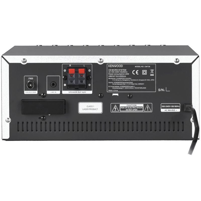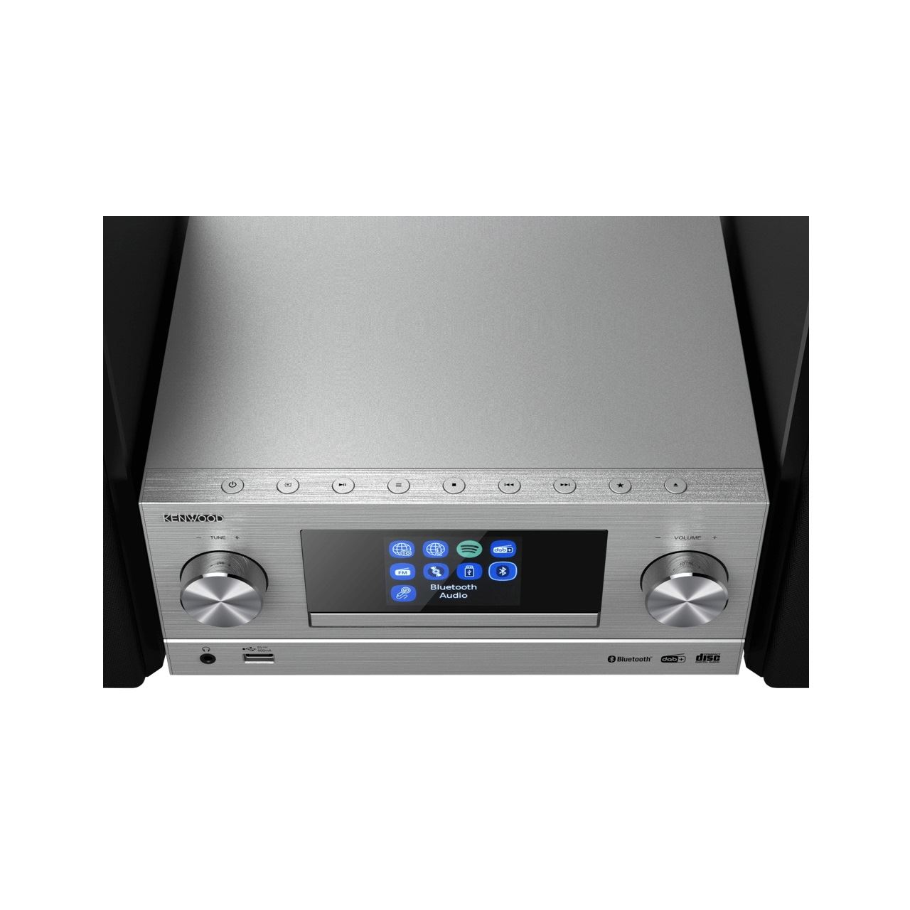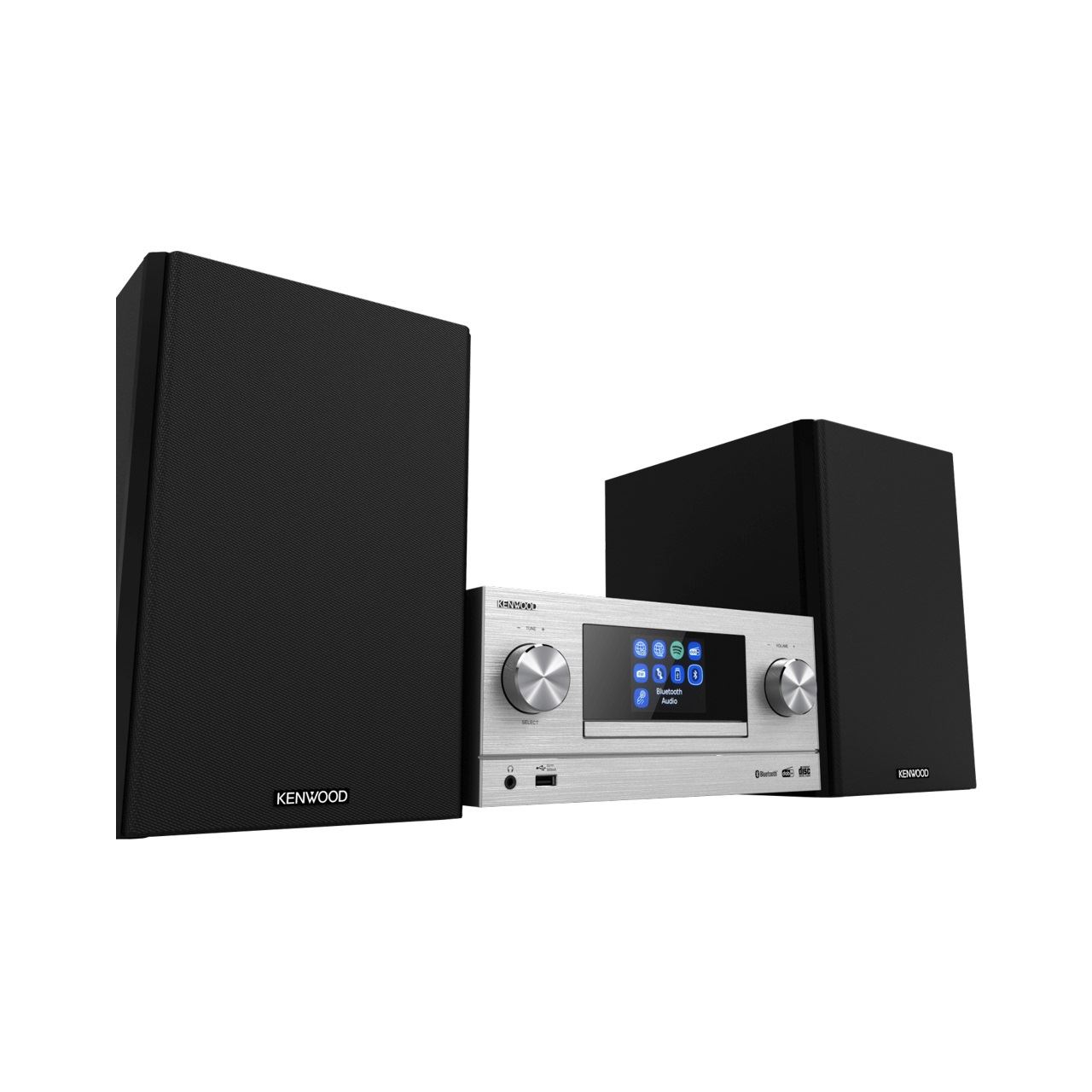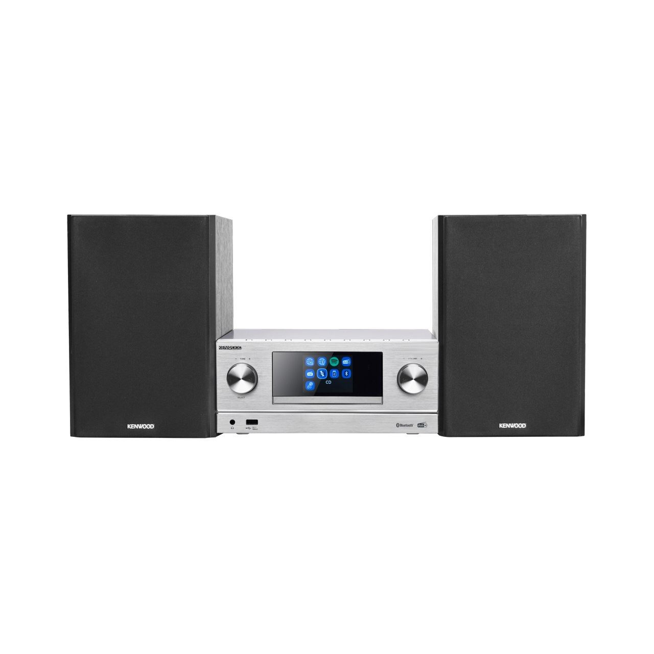 Kenwood M-9000S. Typ: Home-Audio-Minisystem, Produktfarbe: Silber, Anzahl an optischen Scheiben: 1 Disks. RMS-Leistung: 50 W, Lautsprechertyp: 2-Wege, Impedanz: 6 Ohm. Unterstützte Bänder: DAB+, FM, Digitales UKW-Radio: 87,5 - 108 MHz, Internetradio Unterstützungs unterstützt: Spotify. Display-Typ: TFT, Farbe der Hintergrundbeleuchtung: Mehrfarbig. Unterstützte Audioformate: CBR, MP3, MP3 VBR