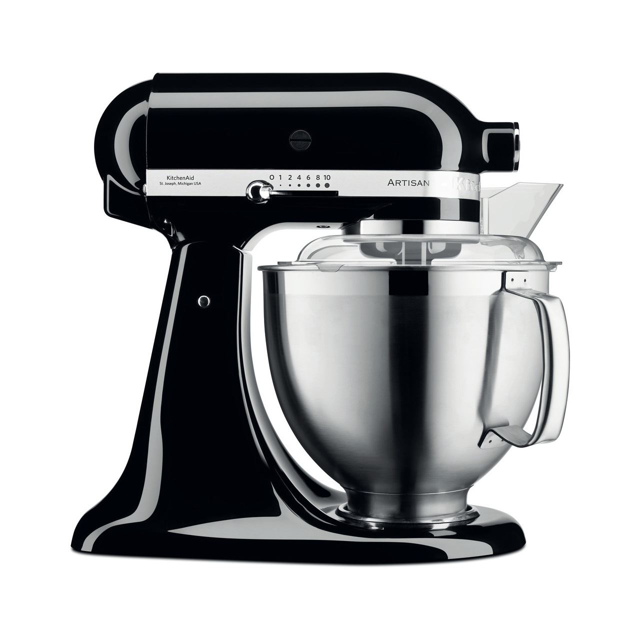 KitchenAid Artisan 5KSM185PS. Schüsselkapazität: 4,8 l, Produktfarbe: Schwarz, Steuerung: Leiter. Schüsselmaterial: Edelstahl. Leistung: 300 W, AC Eingangsspannung: 220 - 240 V, AC Eingangsfrequenz: 50 - 60 Hz. Breite: 240 mm, Tiefe: 370 mm, Höhe: 360 mm. Verpackungsbreite: 406 mm, Verpackungstiefe: 273 mm, Verpackungshöhe: 413 mm