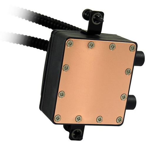 Das quadratische Pumpengehäuse verfügt über eine Bodenplatte aus hochwertigem Kupfer, welche mittels mehrerer Schrauben an dem Kühler befestigt ist. Der Lüfter hingegen ist komplett in Schwarz gehalten und besitzt einen quadratischen Kunststoffrahmen mit einer Höhe von 25mm sowie sieben Lüfterblätter.