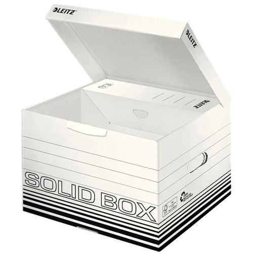 Leitz Solid Box ist die Archivierungslösung fu¨r die Nutzung im Bu¨ro oder Zuhause. Starkes Material sowie doppelter Boden und Wände machen die Boxen ideal fu¨r Aufbewahrung, Versand oder Transport von Dokumenten und schweren Dingen. Mit praktischem Automatik-Aufbau in wenigen Sekunden einsatzbereit. Extrem haltbar und stabil.