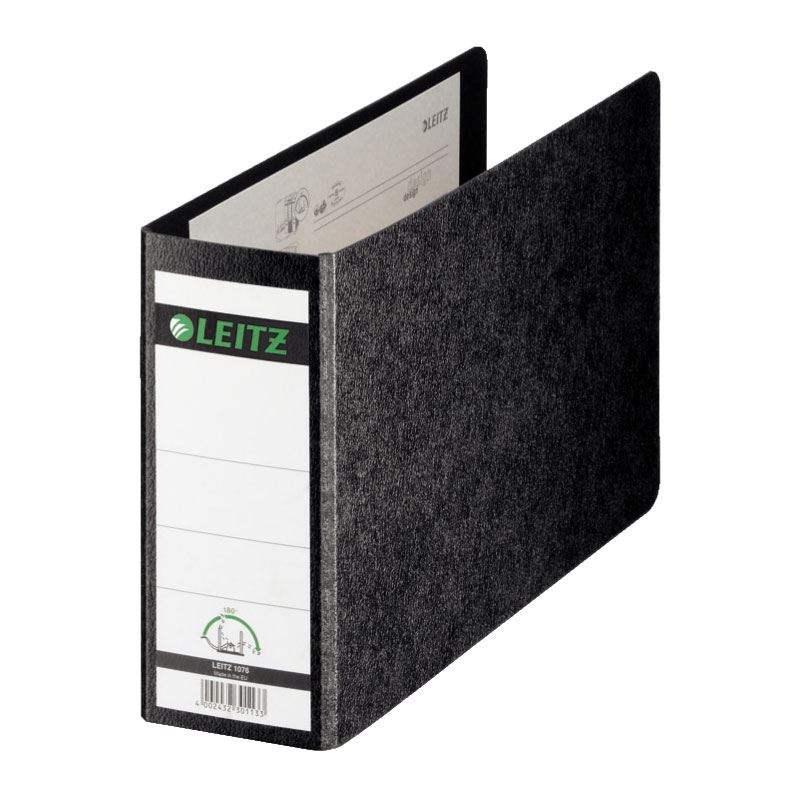 Leitz Qualitäts-Ordner 180° Hartpappe für Sonderformate. Format: A5, Material: Karton, Produktfarbe: Schwarz. Breite: 80 mm, Tiefe: 286 mm, Höhe: 174 mm. Nachhaltigkeitszertifikate: Blue Angel