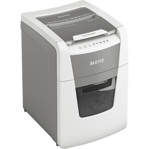 Der Leitz IQ Autofeed Small Office 100 Automatischer Aktenvernichter P5 ist ein vollautomatischer Aktenvernichter von Leitz mit einzigartiger Funktion für sauberes Entleeren des Abfallbehälters. Er ist so intelligent, dass er komplett selbständig arbeitet. Legen Sie einfach Ihren Papierstapel (inkl. Heft- und Büroklammern) ein, schließen Sie den Deckel und beginnen Sie Ihren Tag. Ideal für kleine Büros. Sie erhalten hohe Sicherheit und hervorragende Leistung mit diesem papierstaufreien, leisen und langlaufenden (20 Minuten) Autofeed-Aktenvernichter. Schreddern Sie automatisch 100 A4-Blätter in Sicherheitsstufe P5 kleine Mikroschnitt-Partikel (2 x 15 mm) auf einmal in den großzügigen 34 Liter Behälter. Dank Touch-Control ist er einfach und intuitiv zu bedienen.