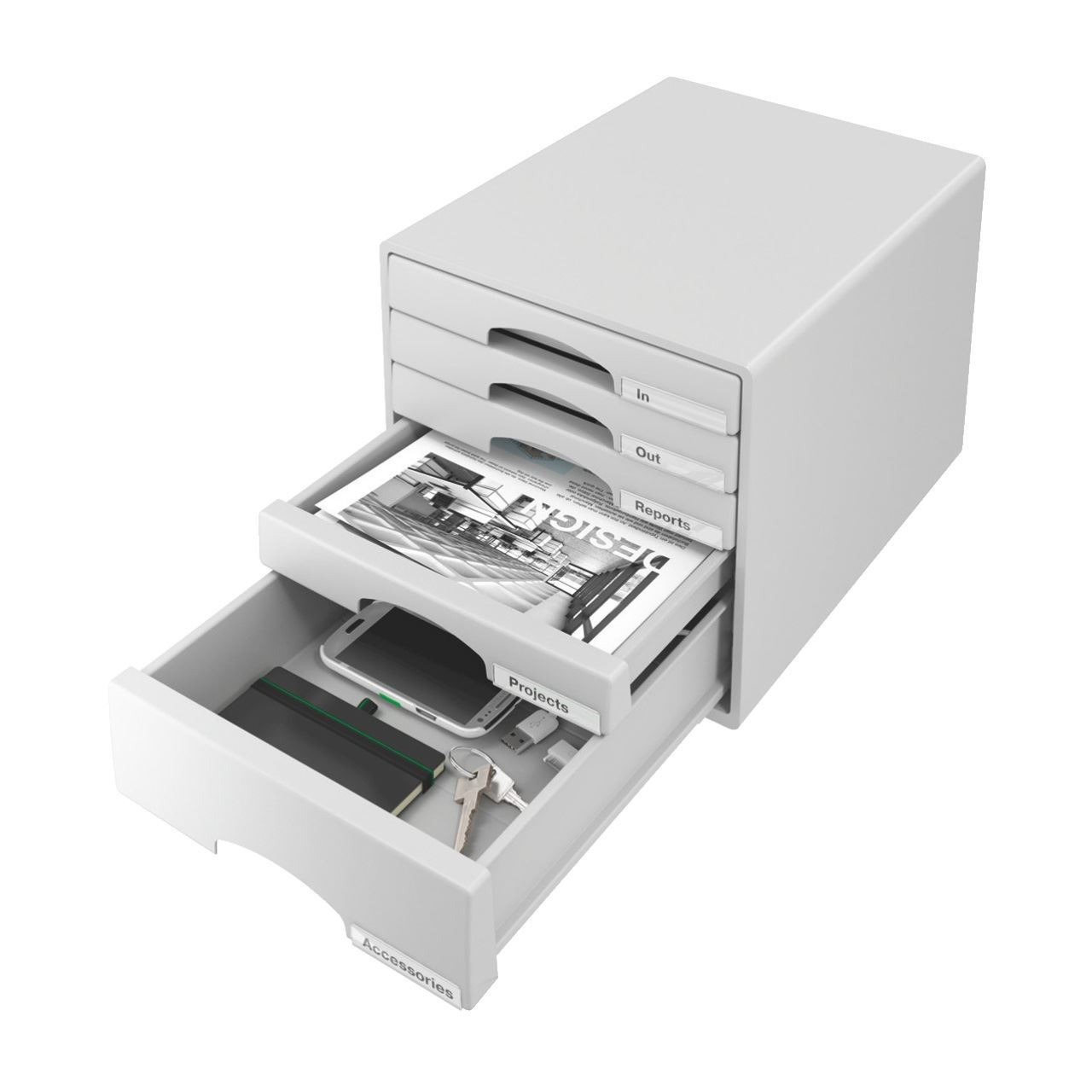 Leitz 52110085. Anzahl der Schubladen: 5 Schublade(n), Material: Kunststoff, Produktfarbe: Grau. Abmessungen (BxTxH): 287 x 363 x 270 mm