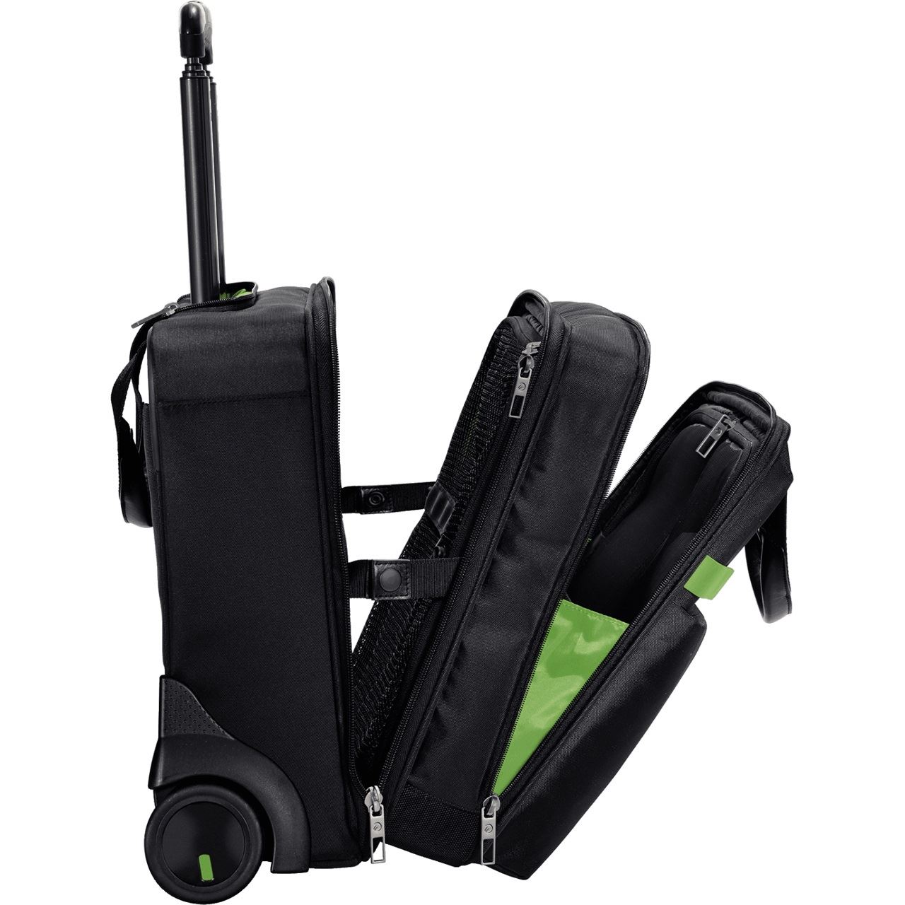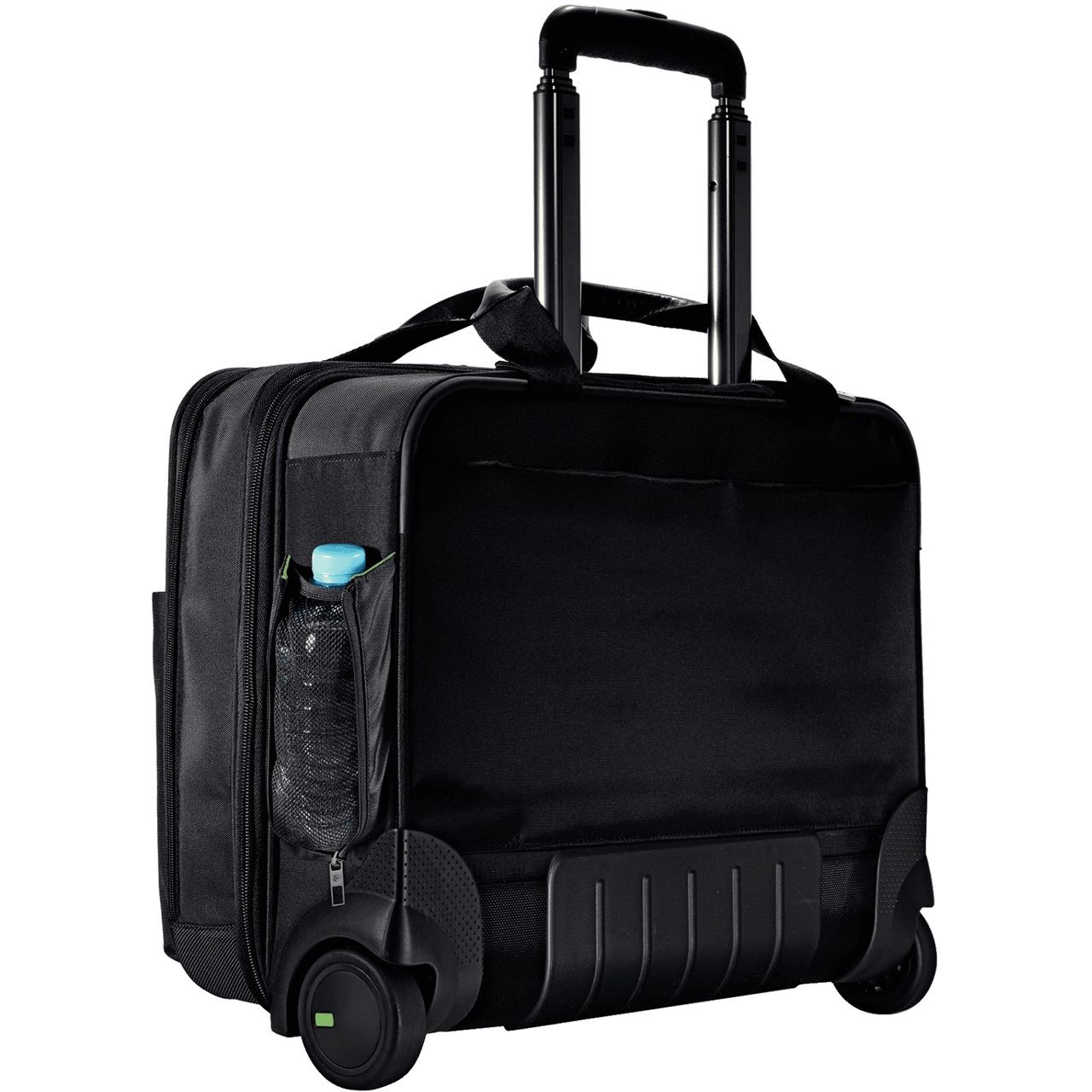 Hochwertiger und leichter Business Trolley mit zwei geräumigen Hauptfächern und einem kleineren Frontfach. Ermöglicht die Trennung zwischen Arbeitsmaterialien und Wäsche. Komfortables Reisen mit dem leichtläufigen 2-Inliner Rollen System (ABEC3) und mehrstufiger Teleskopstange mit Doppelgestänge. Lässt sich an geschmeidigen Echtledergriffen tragen oder fixiert an einem weiteren Trolley. Kann mit allen anderen Taschen der Leitz Complete Serie kombiniert werden.