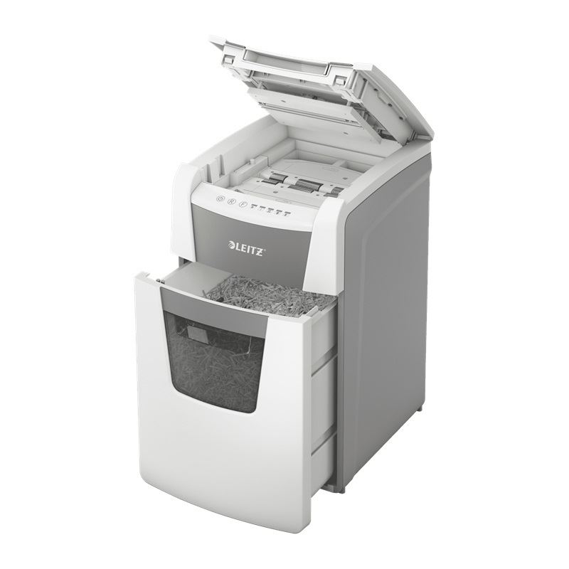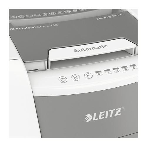 Der Leitz IQ Autofeed Office 150 Automatischer Aktenvernichter P4 ist ein vollautomatischer Aktenvernichter von Leitz mit einzigartiger Funktion für sauberes Entleeren des Abfallbehälters. Er ist so intelligent, dass er komplett selbständig arbeitet. Legen Sie einfach Ihren Papierstapel (inkl. Heftk- und Büroklammern) ein, schließen Sie den Deckel und beginnen Sie Ihren Tag. Ideal für den Einsatz in Büros. Sie erhalten vertrauliche Sicherheit und hervorragende Leistung mit diesem papierstaufreien, leisen und langlaufenden (30 Minuten) Autofeed-Aktenvernichter. Schreddern Sie automatisch 150 A4-Blätter in Sicherheitsstufe P4 kleine Partikel (4 x 28 mm) auf einmal in den großzügigen 44 Liter Behälter. Dank Touch-Control ist er einfach und intuitiv zu bedienen.