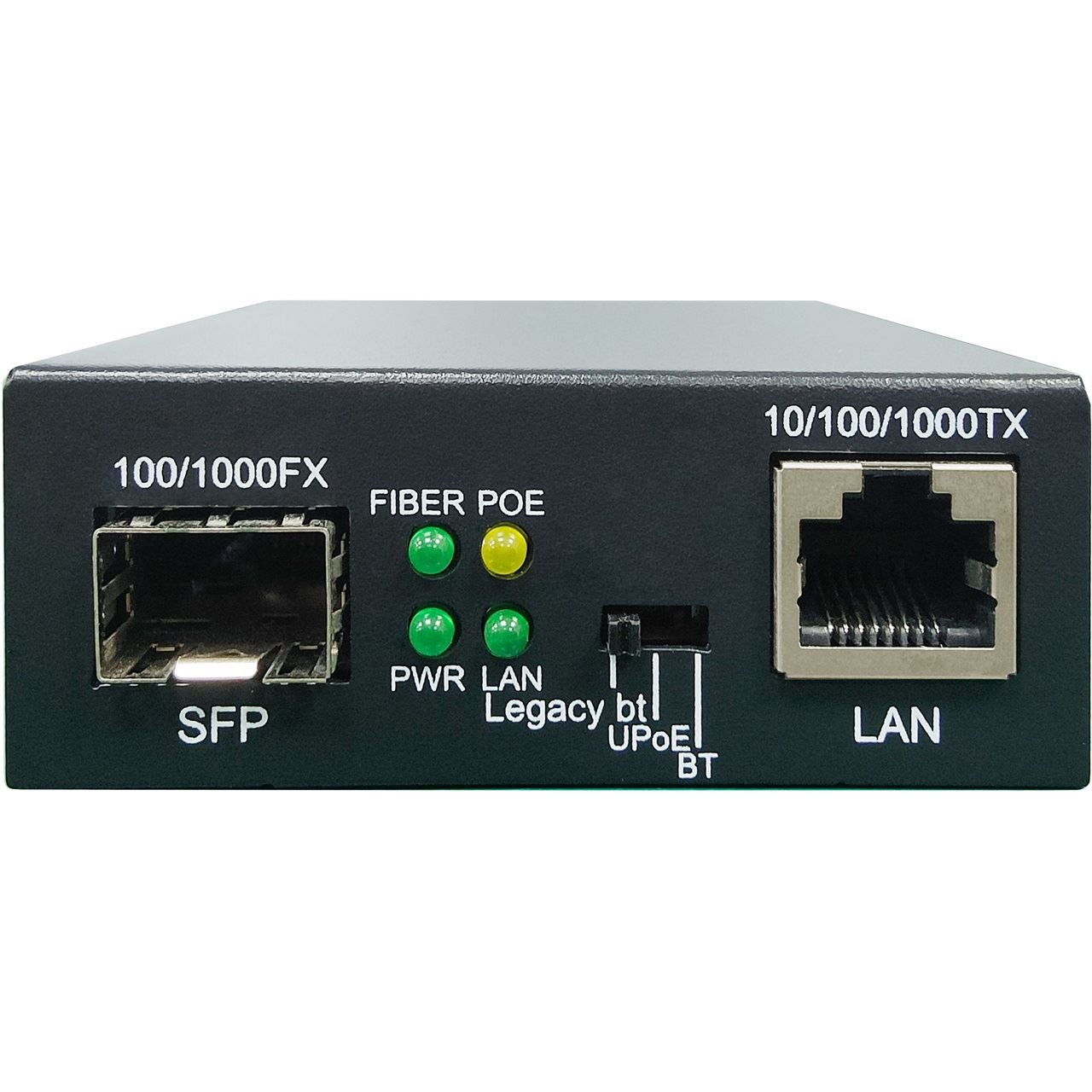 LevelOne RJ45-zu-SFP-Gigabit-Medienkonverter, 802.3bt 60W PoE PSE. Maximale Datenübertragungsrate: 1000 Mbit/s, Netzstandard: IEEE 802.3, IEEE 802.3ab, IEEE 802.3af, IEEE 802.3at, IEEE 802.3bt, IEEE 802.3u, IEEE 802.3x, IEEE..., Ethernet Schnittstellen Typ: Schnelles Ethernet, Gigabit Ethernet. Kabel mode struktur: Multi-Modus, Einzelmodus. LED-Anzeigen: LAN, PoE, Leistung, Produktfarbe: Schwarz. Optischer Kabelverbinder: SFP, Übertragungstechnik: Kabelgebunden. Eingangsspannung: 100 - 240 V, AC Eingangsfrequenz: 50 - 60 Hz, Eingangsstrom: 1.8 A