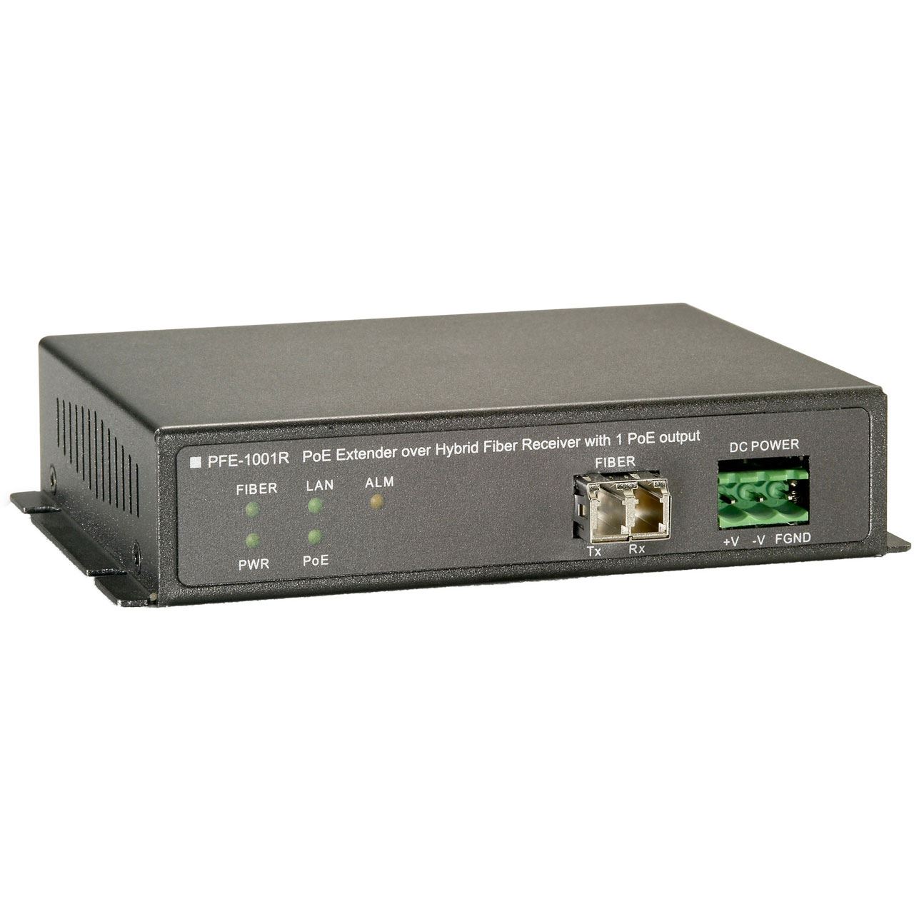 LevelOne PoE Extender, Receiver, Over Hybrid Fiber, 1 PoE-Ausgängen. Typ: Netzwerkempfänger, Maximal mögliche Übertragungsstrecke: 2000 m, Datenübertragungsrate: 100 Mbit/s. Verkabelungstechnologie: 10/100Base-T(X), Netzstandard: IEEE 802.3, IEEE 802.3af, IEEE 802.3at, IEEE 802.3u. Optischer Kabelverbinder: LC. Produktfarbe: Schwarz, Befestigungstyp: Tisch/Wand, LED-Anzeigen: LAN, PoE, Leistung. Stromverbrauch (max.): 60 W, Ausgangsspannung: 56 V