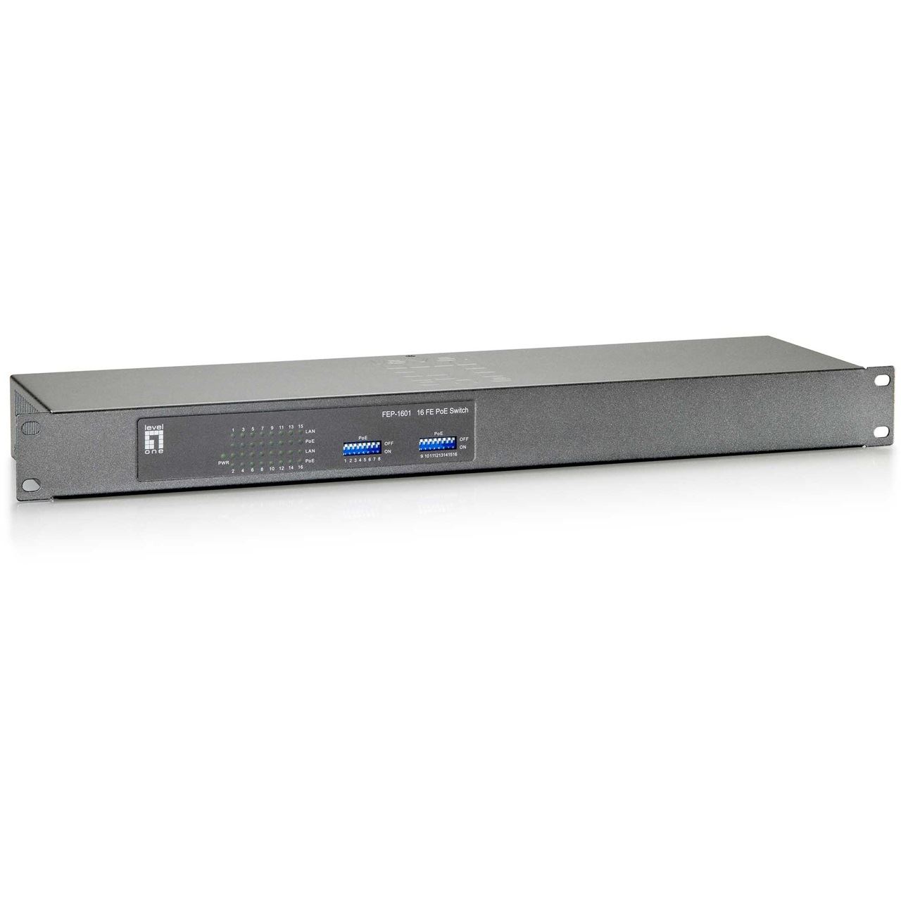 LevelOne FEP-1601W150. Basic Switching RJ-45 Ethernet Ports-Typ: Fast Ethernet (10/100), Anzahl der basisschaltenden RJ-45 Ethernet Ports: 16. Vollduplex. MAC-Adressentabelle: 4000 Eintragungen, Routing-/Switching-Kapazität: 3,2 Gbit/s. Netzstandard: IEEE 802.3, IEEE 802.3u, IEEE 802.3x. Power over Ethernet (PoE). Rack-Einbau