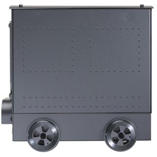 Das 300-Watt-80Plus-Netzteil befindet sich direkt in der Lok, folglich wird das Mini-ITX-Mainboard mitsamt Komponenten im Wagon eingebaut und über je eine Öffnung in beiden Abschnitten mit dem Netzteil sowie dem optionalen Slim-Drive in der Front verbunden. Zusätzlich ist im Gesamtgehäuse Platz für ein 2,5- und ein 3,5-Zoll-Laufwerk. Zweimal USB 3.0 ist ebenfalls bereits integriert.
