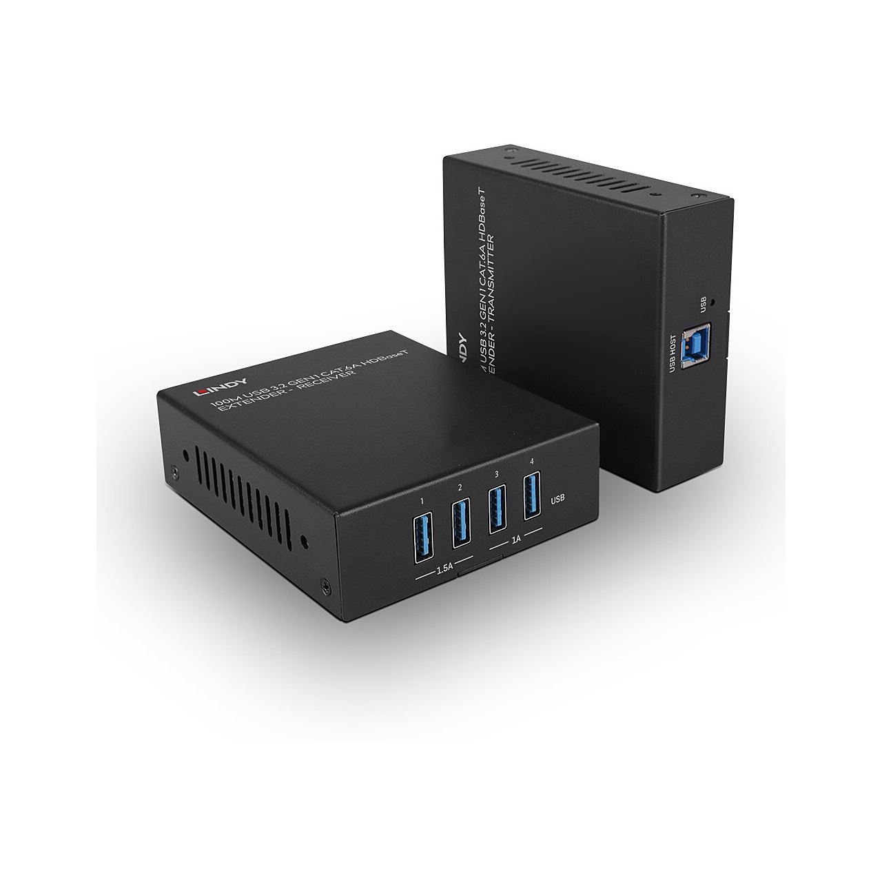 Lindy 43410. Typ: Sender und Empfänger, Übertragungstechnik: Kabelgebunden, Maximal mögliche Übertragungsstrecke: 100 m. Transmitter lokaler Tastatur-/Maus-Anschlusstyp: USB. USB-Port-Typ: USB Type-A/USB Type-B. AC Eingangsspannung: 24 V, Eingangsstrom: 2 A. Breite des Senders: 10 cm, Tiefe des Senders: 8,5 cm, Höhe des Senders: 3 cm