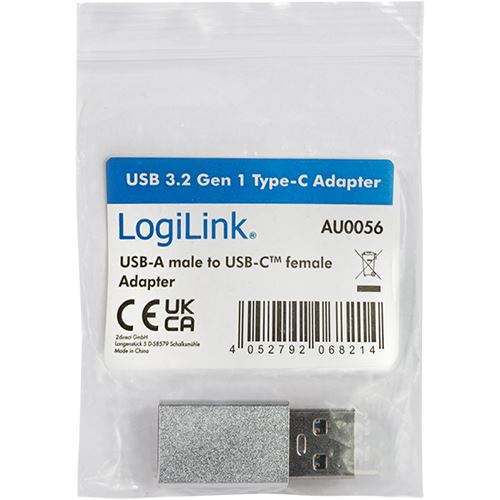 LogiLink AU0056. Hostschnittstelle: USB Typ-C, Ausgangsschnittstelle: USB 3.2 Gen 1 (3.1 Gen 1), Geschlecht der Host-Schnittstelle: Weiblich. Produktfarbe: Silber. Steckverbinder 1 Geschlecht: Männlich, Steckverbinder 2 Geschlecht: Weiblich, Anschluss1 Formfaktor: Gerade. Breite: 14,6 mm, Tiefe: 34 mm, Höhe: 7,4 mm. Menge pro Packung: 1 Stück(e), Verpackungsbreite: 60 mm, Verpackungstiefe: 92 mm