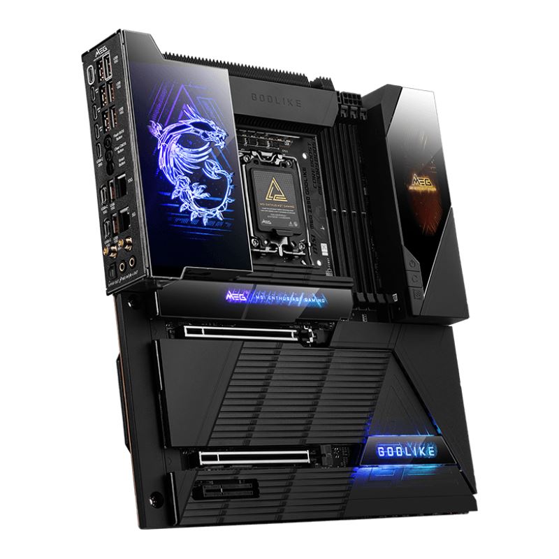 Optisch und technisch beeindruckt das MEG Z890 GODLIKE mit einem edlen Design, robustem PCB-Aufbau, massiver Kühlleistung dank großflächiger Aluminiumkühler sowie einem integrierten LCD Screen, der Systeminformationen darstellen kann, aber auch frei konfigurierbar ist.