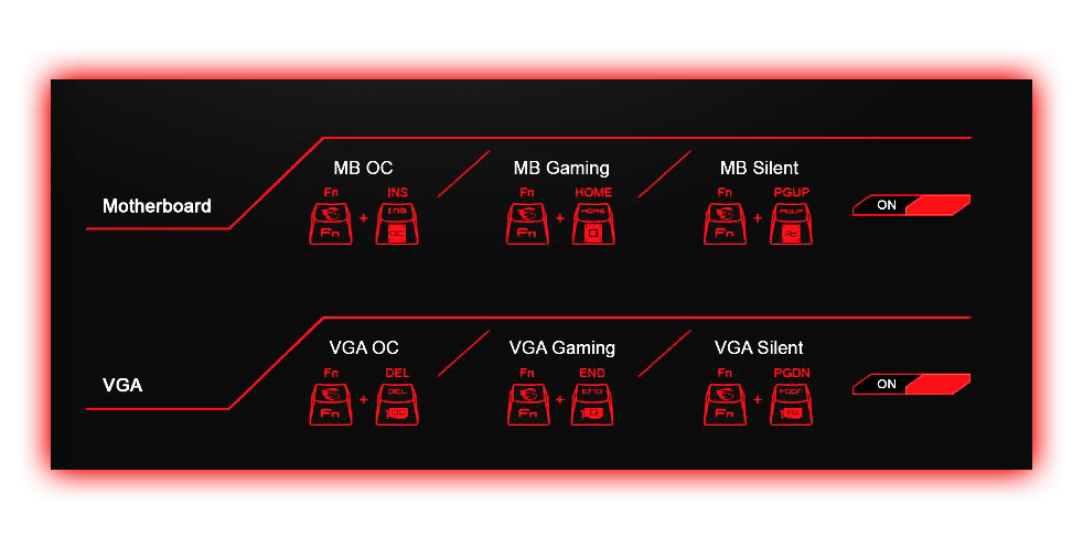 Auf der Tastatur können Hotkeys belegt werden, die eine direkte Steuerung von MSI GAMING Motherboards und Grafikkarten ermöglichen. Dadurch können Sie beispielsweise zwischen drei Performance Modi wechseln, ohne das Spiel verlassen zu müssen.