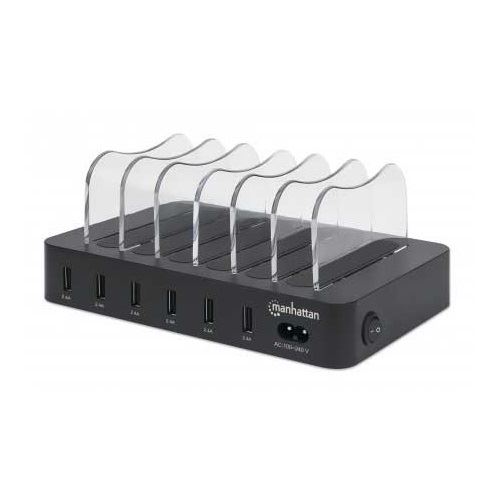 Manhattan 6-Port USB-Ladestation, Sechs USB-A-Ports, bis zu 2,4 A/5 V pro Port, 50 W Ausgangsleistung gesamt, schwarz. Produktfarbe: Schwarz, Zertifizierung: CE FCC RoHS WEEE ETL. Eingangsspannung: 100 - 240 V, Eingangsstrom: 1 A. Breite: 155 mm, Tiefe: 125 mm, Höhe: 76,2 mm. Mitgelieferte Kabel: AC, Menge pro Packung: 1 Stück(e). Konformitätsbescheinigungen: CE, RoHS, WEEE, Eidgenössische Kommunikationskommission (FCC)