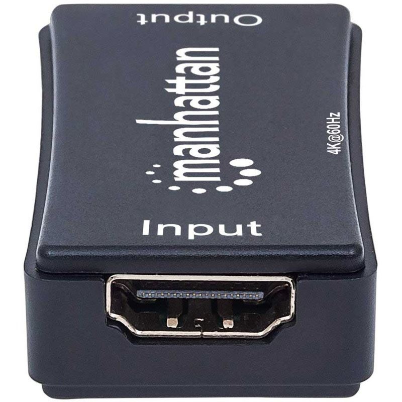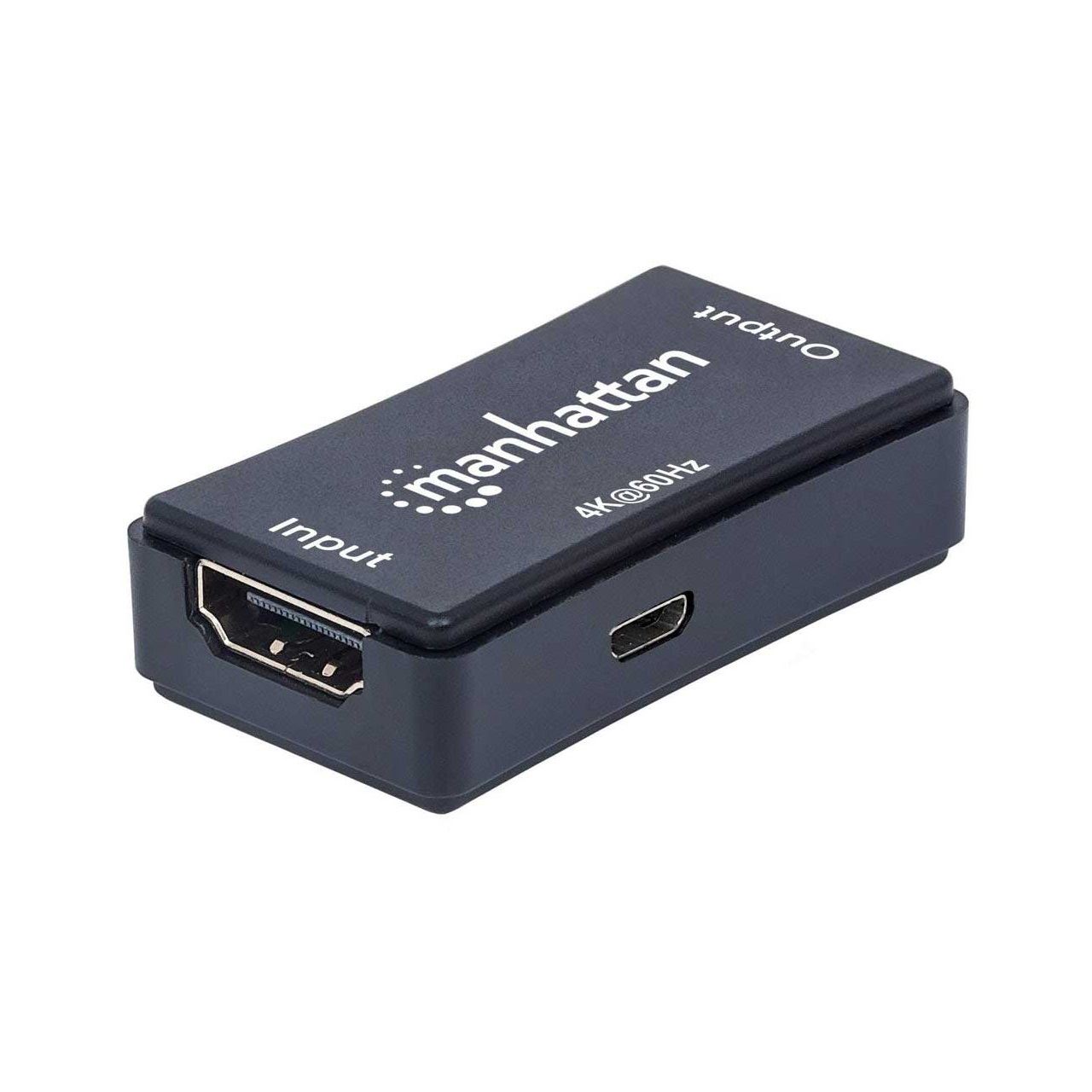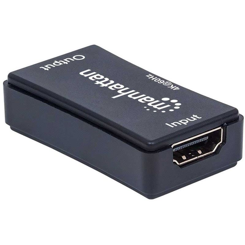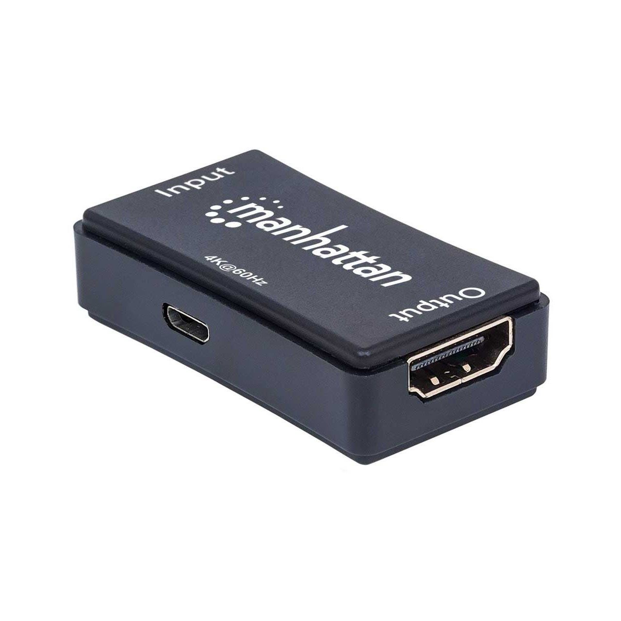 Manhattan 4K HDMI-Repeater, Aktive HDMI-Signalverstärkung, 4K@60Hz, verlängert 4K-Video und Audio auf bis zu 40 m. Typ: AV-Repeater, Maximale Auflösung: 4096 x 2160 Pixel, Maximal mögliche Übertragungsstrecke: 40 m. Übertragungstechnik: Kabelgebunden, USB-Stecker: Micro-USB B. Breite: 28 mm, Tiefe: 50 mm, Höhe: 14 mm. Mitgelieferte Kabel: Mikro-USB