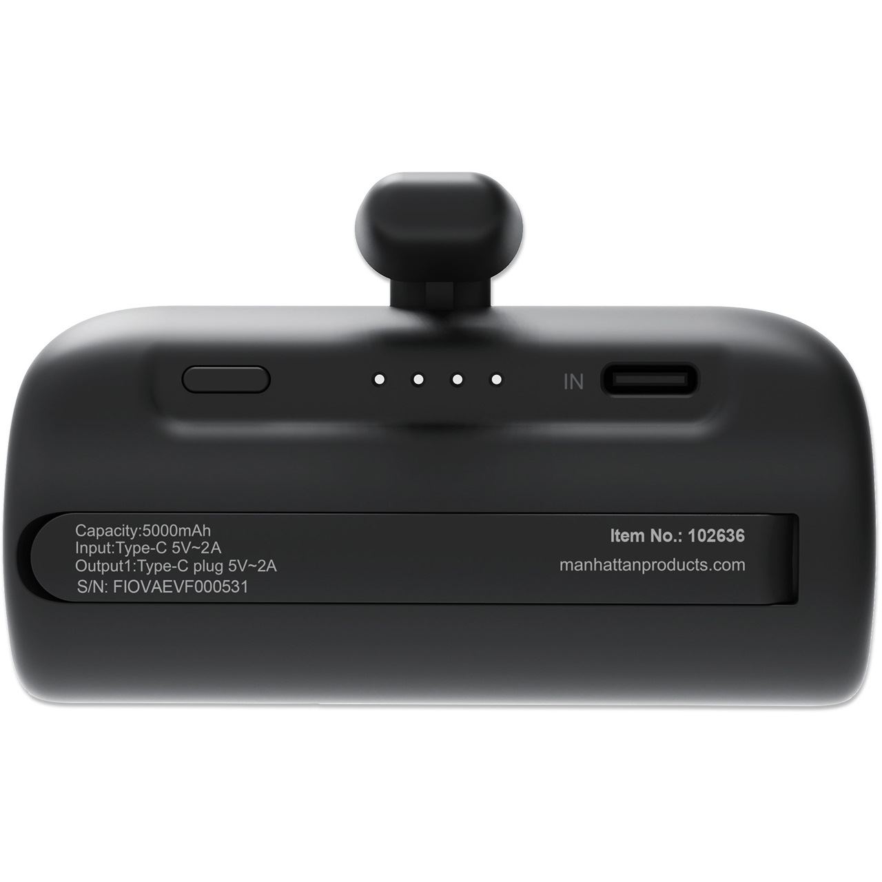 Manhattan 102636. Akku-/Batteriekapazität: 5000 mAh, Akku-/Batterietechnologie: Lithium-Ion (Li-Ion). USB Typ-C Anzahl Anschlüsse: 1. Gesamte Ausgangsleistung: 10 W, Ausgangsstrom: 2 A. Produktfarbe: Schwarz
