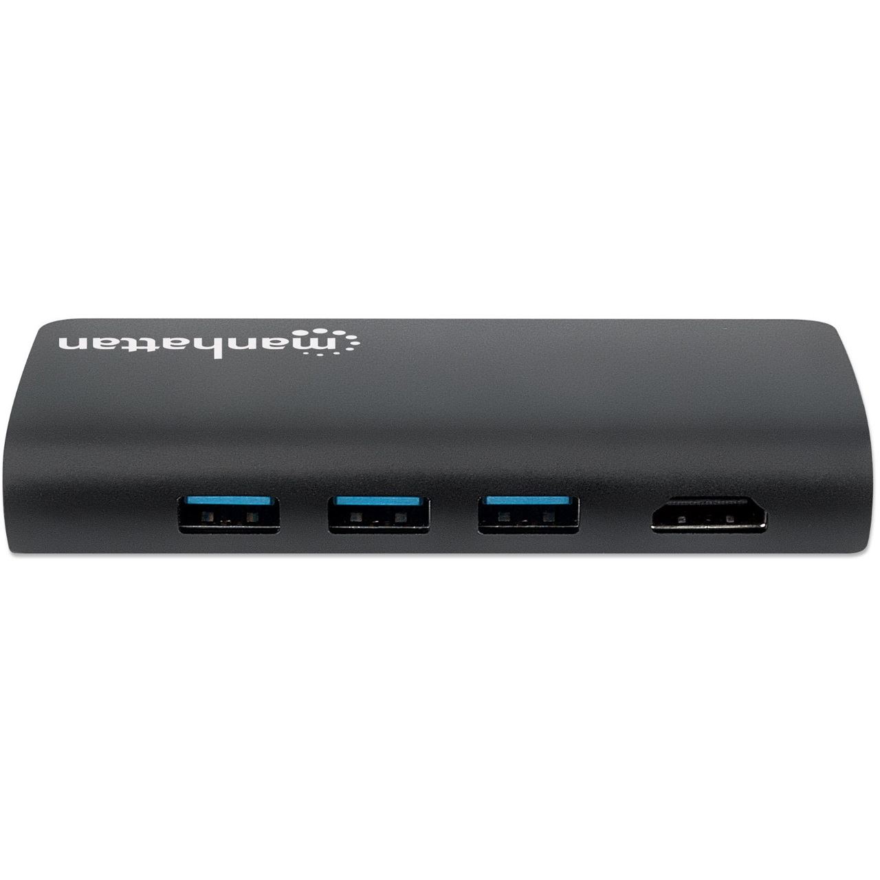 Manhattan USB 3.2 Gen 1 USB-C Multiport-Adapter, USB-C-Stecker auf HDMI-Buchse (4K@30Hz), drei USB-A-Ports, USB-C Power Delivery-Port (PD 3.0), Gigabit RJ45-Port und SD/MicroSD Card Reader, Aluminium, schwarz. Hostschnittstelle: USB 3.2 Gen 1 (3.1 Gen 1) Type-C. Produktfarbe: Schwarz, Kompatible Speicherkarten: MicroSD (TransFlash), SD, SDHC, SDXC, Gehäusematerial: Aluminium. Netzteiltyp: USB, Ausgangsspannung: 20 V, Ausgangsstrom: 5 A. Breite: 110 mm, Tiefe: 45 mm, Höhe: 18 mm. Menge pro Packung: 1 Stück(e)
