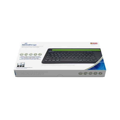 Die MediaRange Kompakt Tastatur ist eine handliche und vielseitige Lösung, die speziell für Multimedia-Geräte wie Smart-TVs, Handys und andere Bluetooth-fähige Geräte konzipiert wurde. Ihr kompaktes Design und das auffällige schwarz-grüne Farbschema machen sie zu einem Hingucker in jeder modernen Umgebung.