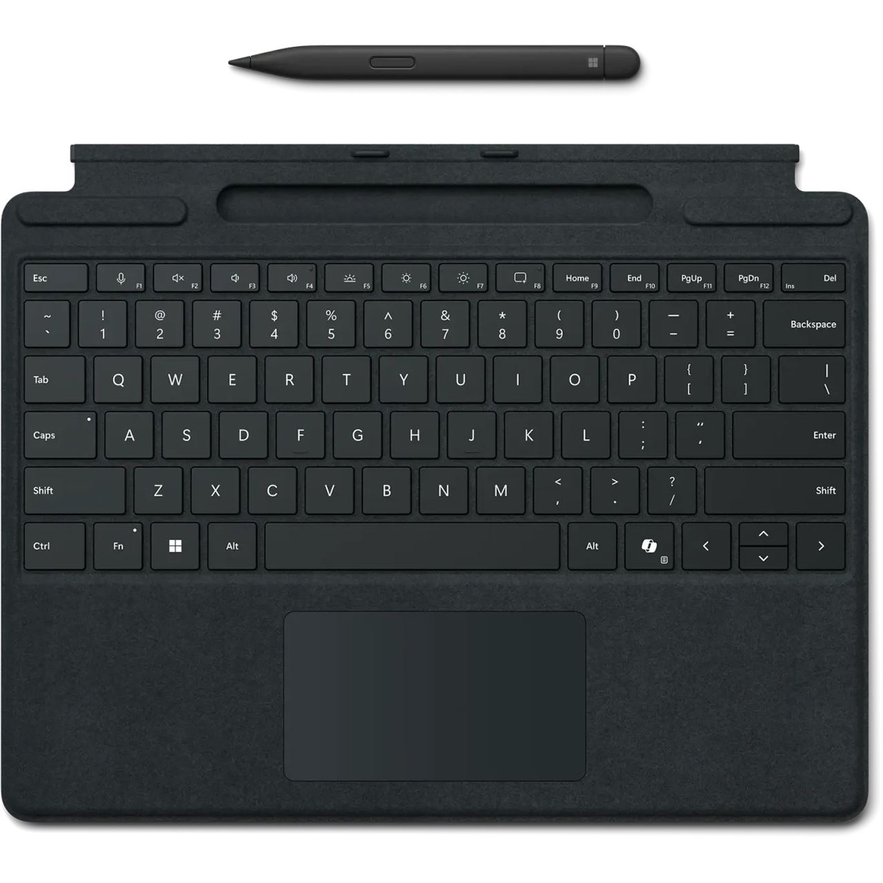 Microsoft Surface Pro Keyboard with Slim Pen for Business. Tastaturaufbau: QWERTY, Tastatursprache: Englisch, Eingabegerät: Touchpad. Markenkompatibilität: Microsoft, Kompatibilität: Surface Pro 10 for Business; Surface Pro 9 for Business; Surface Pro 8 for Business; Surface Pro X..., Produktfarbe: Schwarz. Übertragungstechnik: Andocken, Geräteschnittstelle: Microsoft Cover port. Energiequelle: Dock. Unterstützt Windows-Betriebssysteme: Windows 10, Windows 11