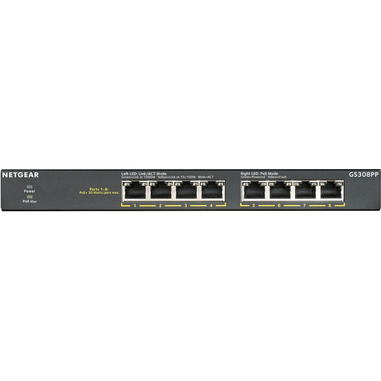 NETGEAR GS308PP. Switch-Typ: Unmanaged. Basic Switching RJ-45 Ethernet Ports-Typ: Gigabit Ethernet (10/100/1000), Anzahl der basisschaltenden RJ-45 Ethernet Ports: 8. Vollduplex. MAC-Adressentabelle: 4000 Eintragungen, Routing-/Switching-Kapazität: 16 Gbit/s. Netzstandard: IEEE 802.1p, IEEE 802.3, IEEE 802.3ab, IEEE 802.3az, IEEE 802.3i, IEEE 802.3u, IEEE 802.3x. DC input Spannung: 54 V. Netzstecker: DC-Anschluss. Power over Ethernet (PoE). Wandmontage, Rack-Einbau