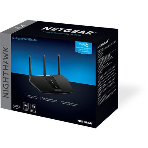 NETGEAR Nighthawk AX/5-Stream AX2400 WiFi 6 Router (RAX30). WAN-Verbindungstyp: RJ-45. WLAN-Band: Dual-Band (2,4 GHz/5 GHz), Top WLAN-Standard: Wi-Fi 6 (802.11ax), WLAN Datentransferrate (max.): 2400 Mbit/s. Schnittstellentyp Ethernet-LAN: Gigabit Ethernet, Ethernet LAN Datentransferraten: 1000 Mbit/s. Unterstützte Sicherheitsalgorithmen: 128-bit AES, AES, WPA3. Produkttyp: Tabletop-Router, Produktfarbe: Schwarz