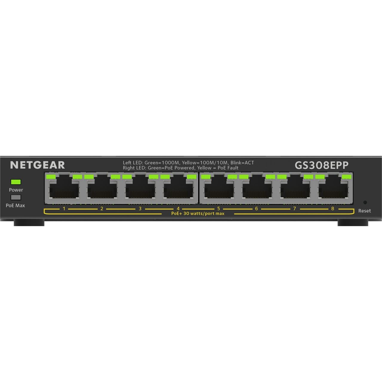 NETGEAR 8-Port Gigabit Ethernet High-Power PoE+ Plus Switch (GS308EPP). Switch-Typ: Managed, Switch-Ebene: L2/L3. Basic Switching RJ-45 Ethernet Ports-Typ: Gigabit Ethernet (10/100/1000), Anzahl der basisschaltenden RJ-45 Ethernet Ports: 8. Vollduplex. MAC-Adressentabelle: 4000 Eintragungen, Routing-/Switching-Kapazität: 16 Gbit/s. Netzstandard: IEEE 802.3, IEEE 802.3ab, IEEE 802.3u, IEEE 802.3x, IEEE 802.3at, IEEE 802.3af. Power over Ethernet (PoE)