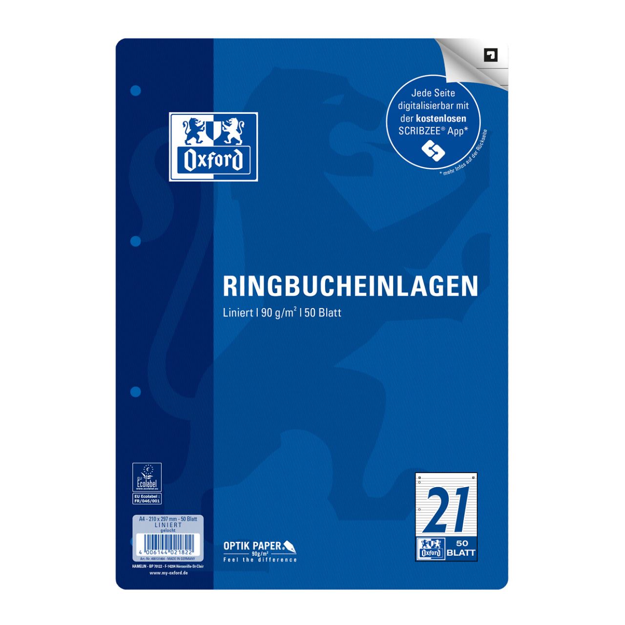 Oxford Ringbucheinlagen A4 - ideal für Notizen! Dank des OPTIK PAPERS® (90 g/m²) ist das Papier von besonderer Qualität. Sie können auf beiden Seiten des Papiers schreiben, ohne dass die Tinte durchscheint. Das Papier kann problemlos in einem Ringbuch aufbewahrt werden. Mit der kostenlosen SCRIBZEE®-App können Sie jede Seite scannen, sodass das erneute Tippen Ihrer Notizen der Vergangenheit angehört. Scannen, speichern und teilen Sie Ihre Notizen einfach.