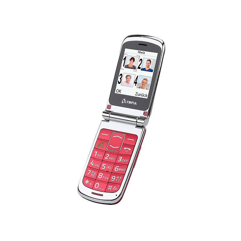 Olympia 2282. Formfaktor: Klappgehäuse. SIM-Kartensteckplätze: Dual-SIM. Bildschirmdiagonale: 6,1 cm (2.4"). Bluetooth. FM-Radio. Akku-/Batterietechnologie: Lithium-Ion (Li-Ion), Akku-/Batteriekapazität: 600 mAh, Standby-Zeit (2G): 120 h. Gewicht: 90 g. Produktfarbe: Rot, Silber