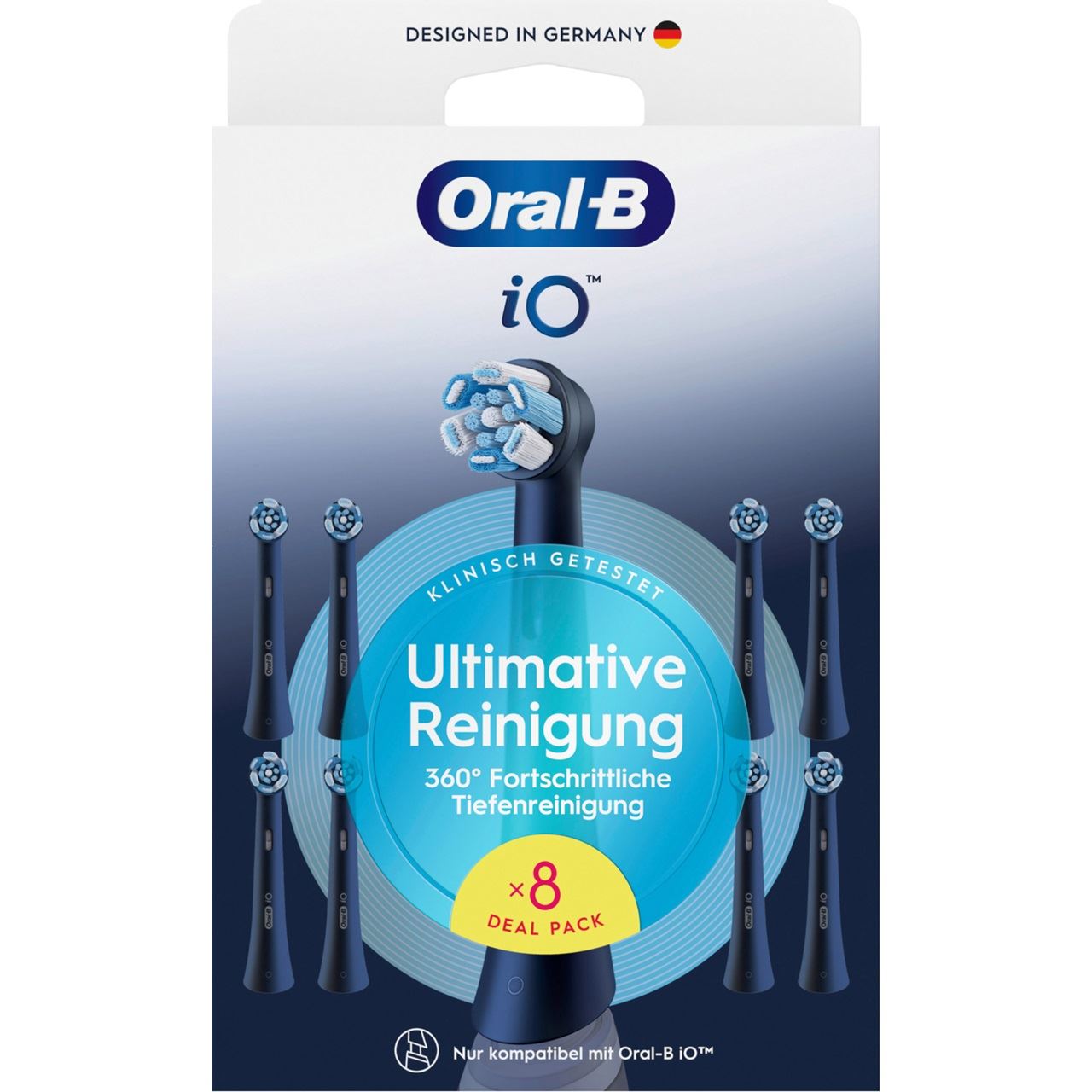 Die Oral-B iO Ultimative Reinigung Aufsteckbürsten kombinieren kraftvolle, aber sanfte Mikrovibrationen mit unserem einzigartigen, von ZahnärztInnen inspirierten runden Bürstenkopf für ein professionelles Reinigungsgefühl jeden Tag. Exklusiv für Oral-B iO elektrische Zahnbürsten entwickelt, helfen die Ultimative Reinigung Bürstenköpfe, bis zu 100% mehr Plaque als eine herkömmliche Handzahnbürste zu entfernen und lassen die Zähne sauber und hell erscheinen. Präzise auf 16 Grad geneigt, helfen die gebündelten Borsten, schwer erreichbare Stellen im Mund zu reinigen. Da ZahnärztInnen empfehlen, für beste Ergebnisse, den Bürstenkopf alle 3 Monate zu wechseln, verfügen Oral-B Ersatzbürstenköpfe über farbwechselnde Borsten, die signalisieren, wenn es Zeit für einen Wechsel ist. Überlegene Reinigungskraft mit den einzigen Aufsteckbürsten, die exklusiv - und bedeutet passend - für die Oral-B iO elektrische Zahnbürste entwickelt wurden.