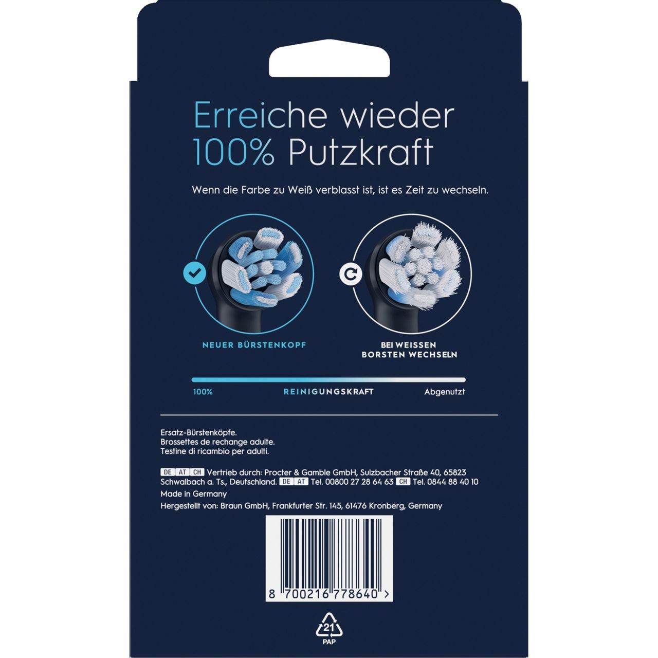Oral-B 8700216778640. Anzahl enthaltener Bürstenköpfe: 8 Stück(e), Produktfarbe: Schwarz, Austauschzeitraum der Gesichtsreinigungsbürste: 3 Monat( e). Breite: 106 mm, Tiefe: 34 mm, Höhe: 175 mm. Verpackungsbreite: 189 mm, Verpackungstiefe: 228 mm, Verpackungshöhe: 124 mm