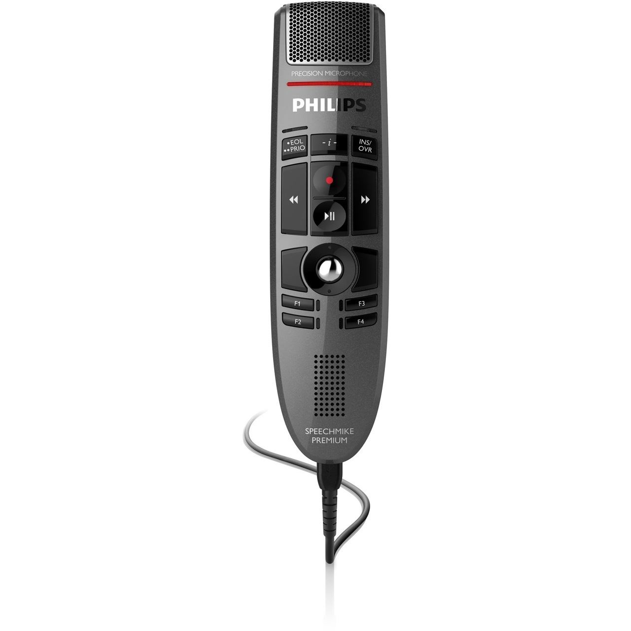 Philips SpeechMike Premium USB-Diktiermikrofon. Rauschverhältnis (SNR): 70 dB, Frequenzbereich: 200 - 12000 Hz. Ausgangsleistung: 200 mW, Lautsprecherdurchmesser: 3 cm. Schnittstelle: USB, USB-Stecker: USB Typ-A. Gewicht: 210 g, Breite: 45 mm, Tiefe: 175 mm. Min. benötigter RAM: 1000 MB, Min. benötigter Speicherplattenplatz: 250 MB, Minimum Prozessor: Intel Pentium 4, 1.0 GHz