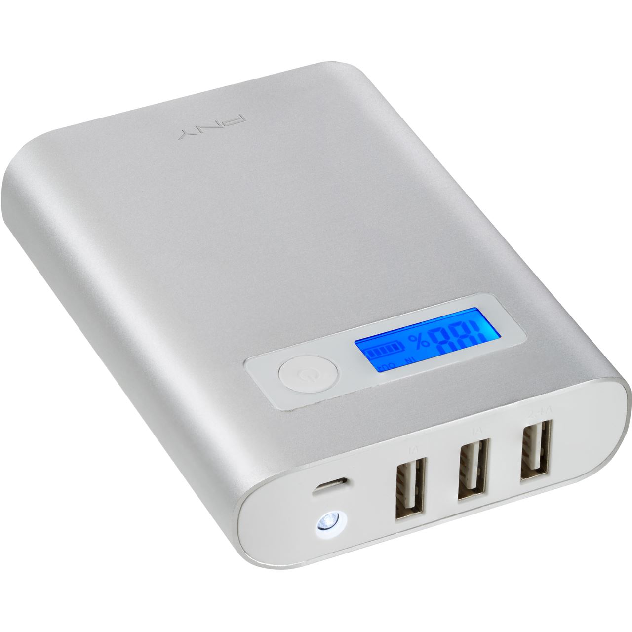Die Energietankstelle von PNY kann Ihre mobilen Endgeräte mit Energie versorgen, wenn keine Steckdose oder andere Stromquelle zur Verfügung steht. Mit einer Ladekapazität von 10.400 mAh und drei USB-Anschlüssen (1A/1A/2.4A) ist der externe Akku besonders leistungsfähig und lange einsetzbar. Die schlanke Bauweise und das stabile Alugehäuse lassen das Powerpack schnell und einfach in jeder Tasche verstauen. Einzigartig und praktisch ist auch die digitale Ladeanzeige, die Sie immer über die verbleibende Kapazität aufklärt.