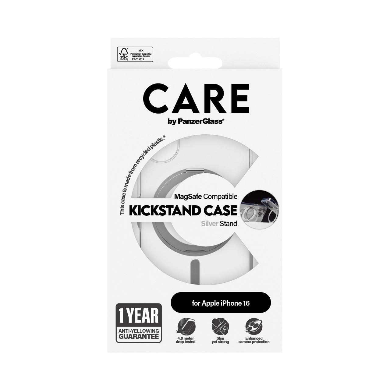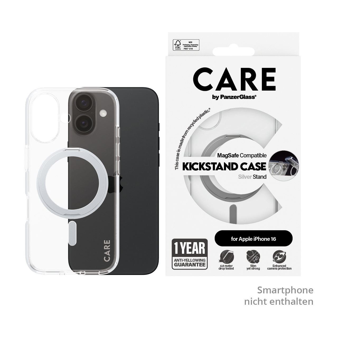 PanzerGlass CARE™ by ® Case Transparent m. Silber Kickstand & MagSafe iPhone 16. Etui-Typ: Cover, Markenkompatibilität: Apple, Kompatibilität: Apple - iPhone 16, Produktfarbe: Transparent