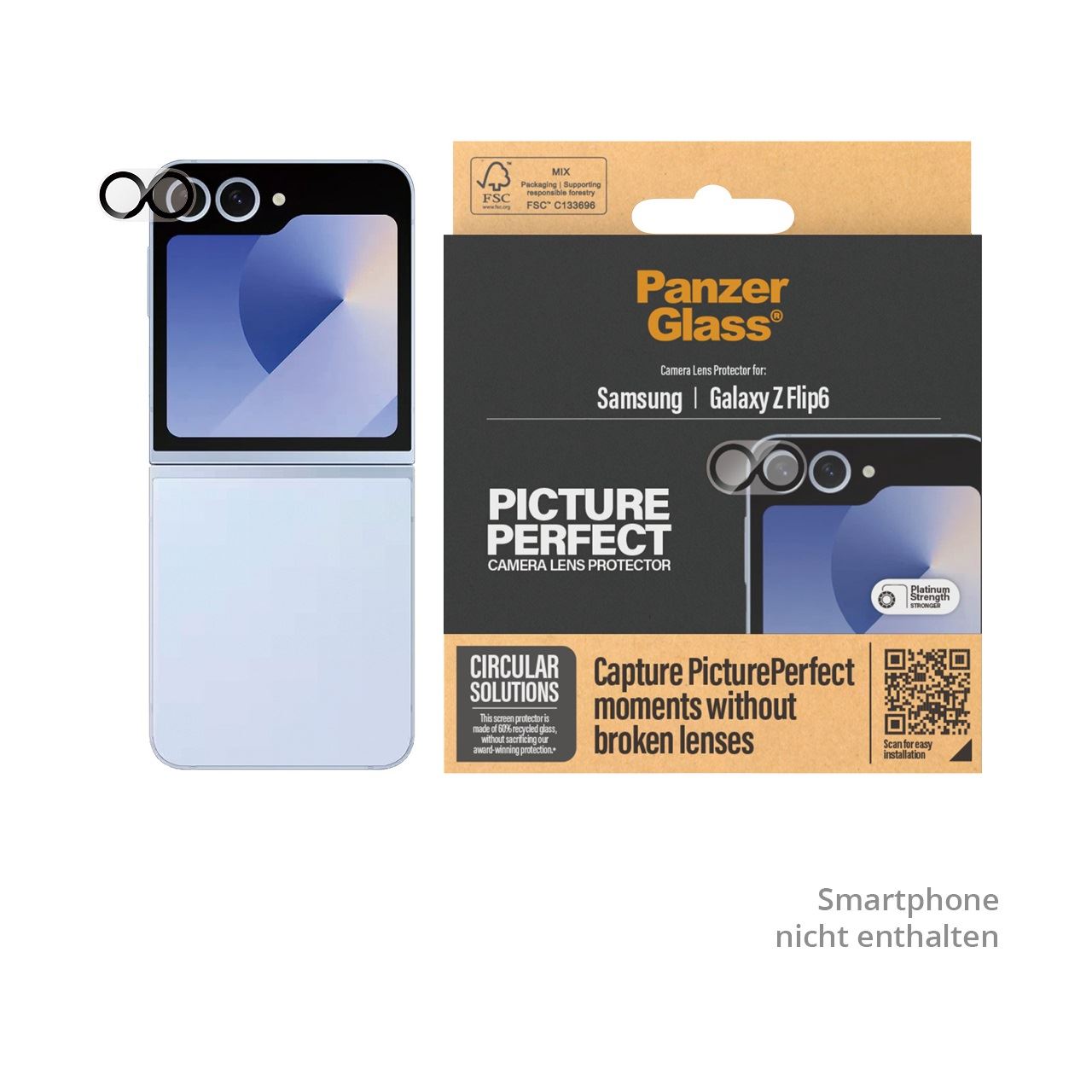 PanzerGlass ® PicturePerfect Karmeraschutz Samsung Galaxy Z Flip6. Markenkompatibilität: Samsung, Kompatibilität: Samsung - Galaxy Z Flip6. Trockene Anwendung. Schutzfunktion: Kratzresistent, Schockresistent. Material: Gehärtetes Glas, Silikon, Produktfarbe: Transparent. Menge pro Packung: 1 Stück(e)