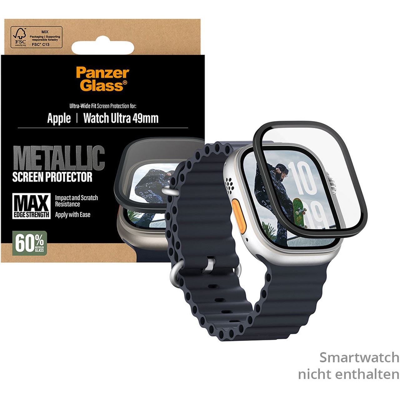 PanzerGlass ® Displayschutz Metallic Apple Watch Ultra 3 | Ultra 2 | Ultra | 49mm. Markenkompatibilität: Apple, Kompatibilität: Apple - Watch Ultra 49mm, Apple - Watch Ultra 2 49mm, Apple - Watch Ultra 3 49mm. Trockene Anwendung. Schutzfunktion: Kratzresistent, Schockresistent. Material: Gehärtetes Glas, Polyethylenterephthalat, Silikon, Produktfarbe: Transparent. Menge pro Packung: 1 Stück(e)