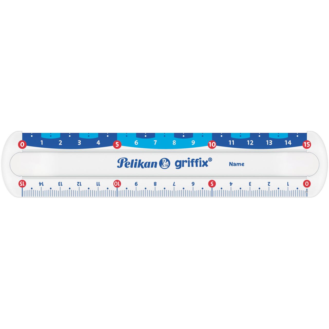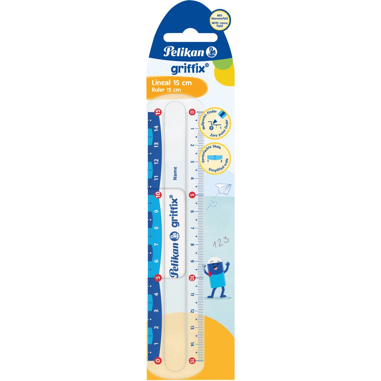 Pelikan griffix® Lineal , Länge 15 cm, mit 2 Skalen: 1 Skala zum ersten Messen und Rechnen mit vollen Zentimetern und eine herkömmliche Skala. Die kleine Stufe am Nullpunkt hilft bei der Orientierung wie die Hervorhebungen aller 5 cm. Mit praktischem Namensfeld in der großen Griffzone und Zirkelführungsloch zum präzisen Abtragen von Strecken. Dank Tuscheschiene auf der Unterseite kein Verschmieren von Tinte und leichtes Aufnehmen vom Tisch. Hochtransparentes PS-Material. 1 Stück in Hänge-Sichtverpackung aus Karton mit Euroloch.