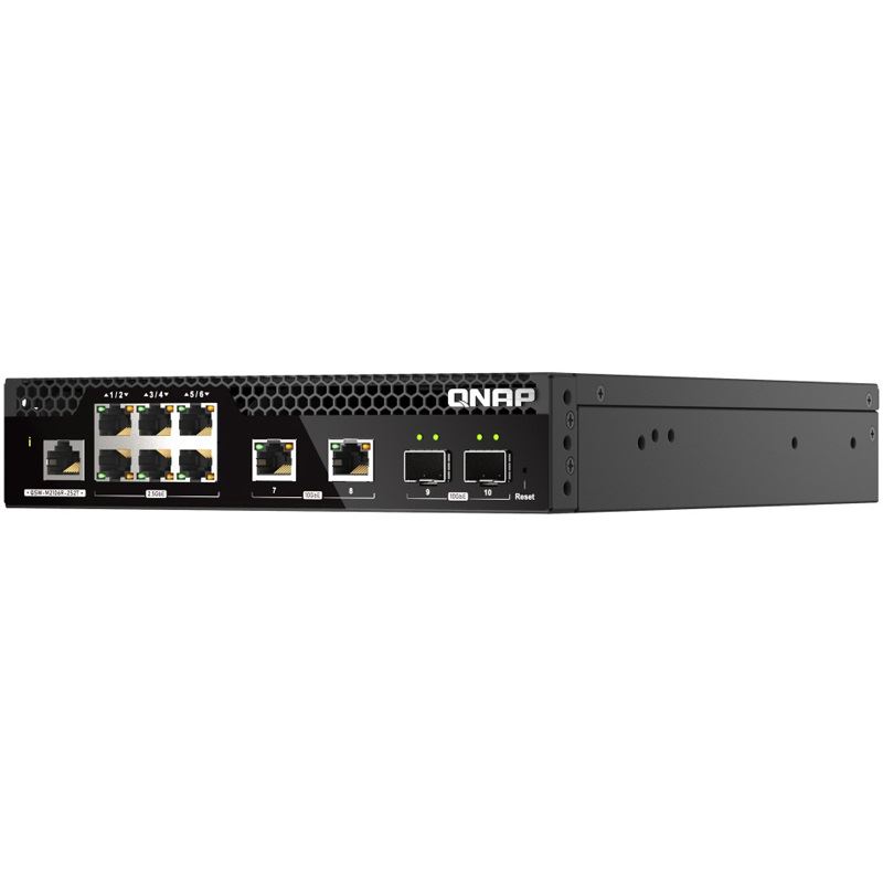 QNAP QSW-M2106R-2S2T. Switch-Typ: Managed, Switch-Ebene: L2. Basic Switching RJ-45 Ethernet Ports-Typ: 10G Ethernet (100/1000/10000), Anzahl der basisschaltenden RJ-45 Ethernet Ports: 2, Anzahl installierte SFP Module: 2, Konsolen-Port: RJ-45. MAC-Adressentabelle: 16000 Eintragungen, Routing-/Switching-Kapazität: 110 Gbit/s. Netzstandard: IEEE 802.1Q, IEEE 802.1ab, IEEE 802.1ad, IEEE 802.1p, IEEE 802.1w, IEEE 802.3, IEEE 802.3ab, IEEE.... Rack-Einbau, Formfaktor: 1U