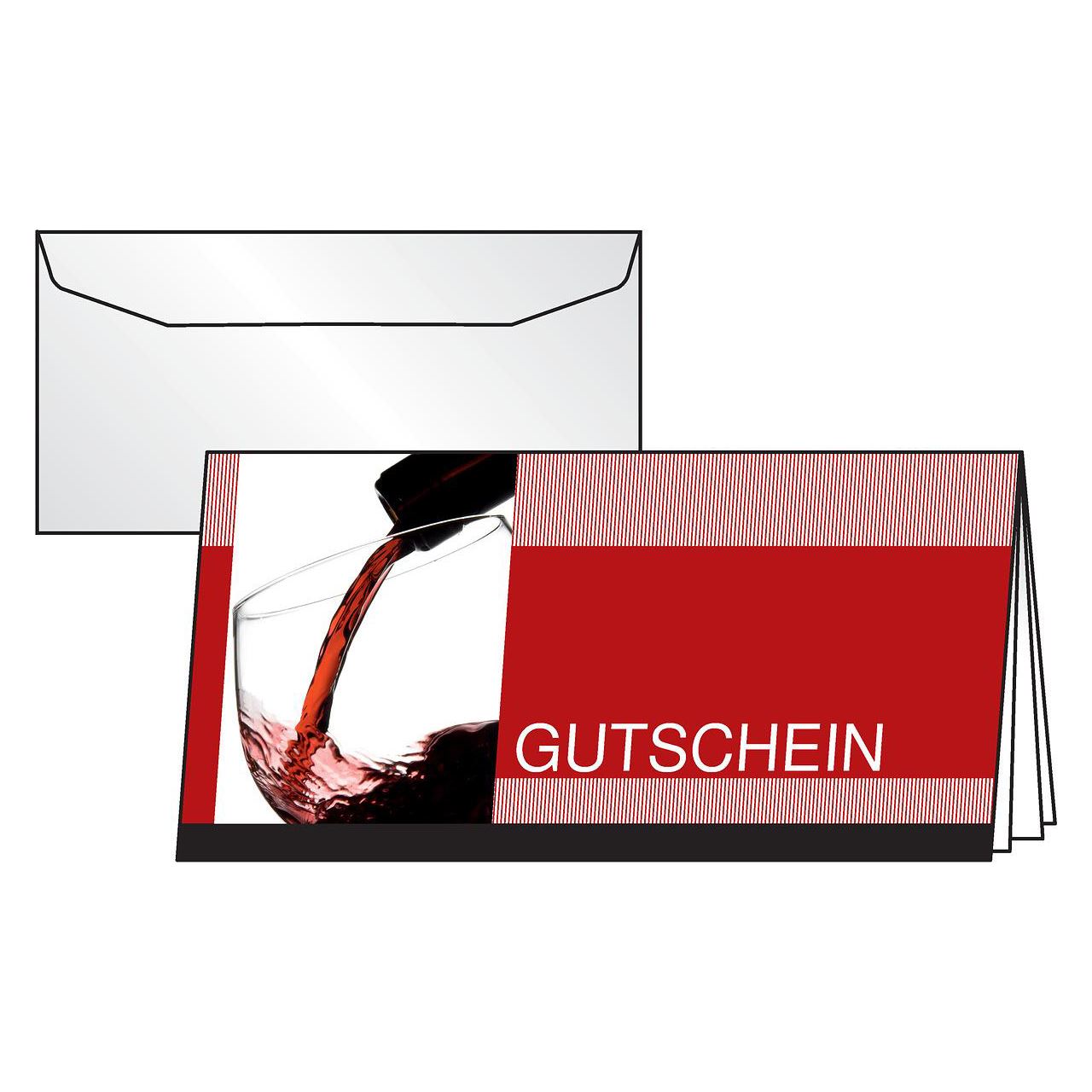 Gutschein-Karten "Vino Rosso" mit einem Weinglas, das gerade befüllt wird und bordeauxroten Designelementen als Motiv. Die Karten sind individuell einsetzbar und haben einen bereits vorgedruckten Innentext zum schnelleren Ausfüllen Die Gutscheine sind zum Bedrucken mit InkJet- und Laser-Drucker sowie zum Kopieren geeignet und haben eine Grammatur von 220g/m². Im Lieferumfang sind 10 Stück im Format DIN lang enthalten, inklusive passener transparenter Umschläge.