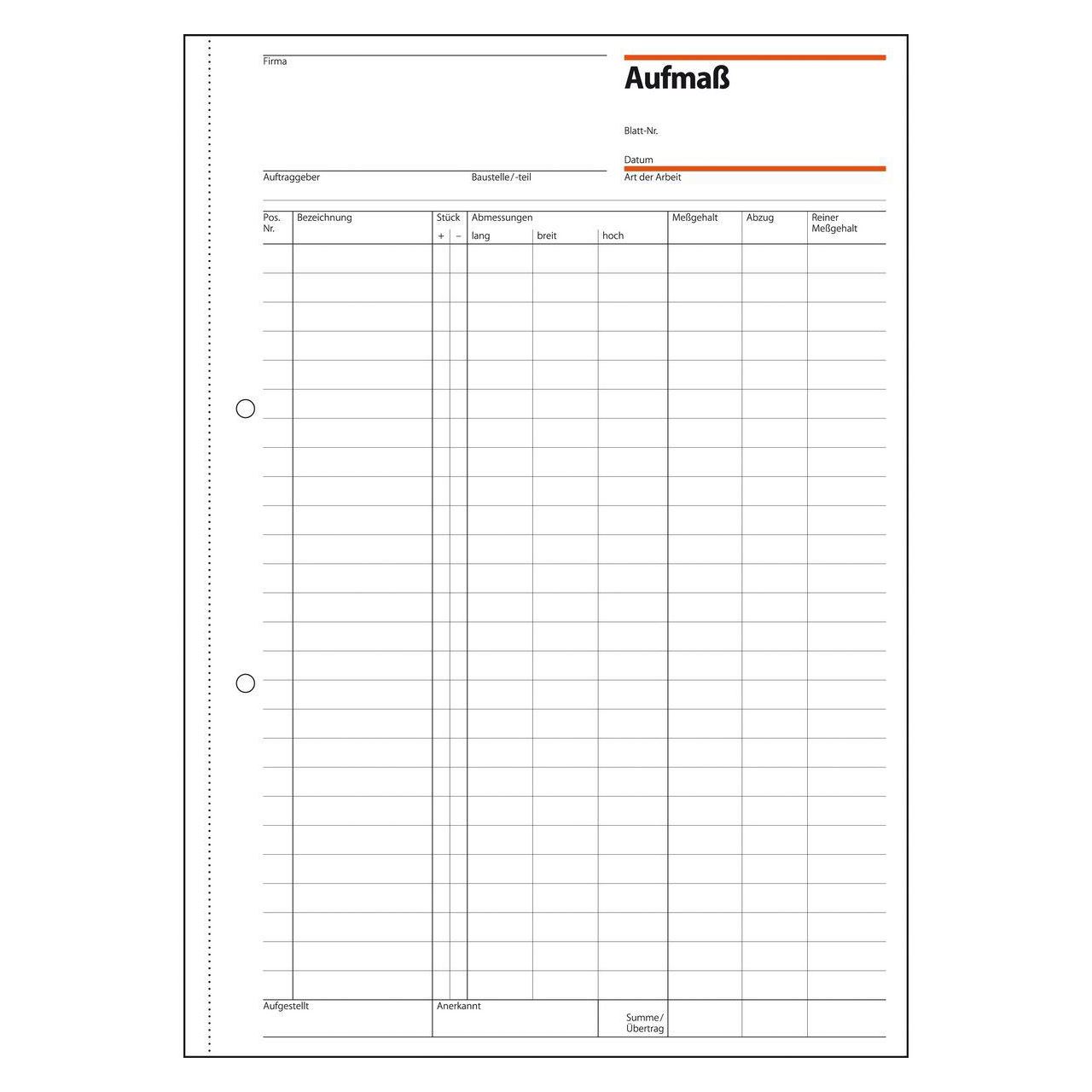 Aufmaßbuch speziell für Bau und Handwerk im Format DIN A4 mit 50 Blatt und zusätzlichem Blaupapier, FSC® zertifiziert. Verwendung mit und ohne Durchschlag möglich. Eine Sicherheitsbindung macht das Formularbuch besonders stabil und haltbar.