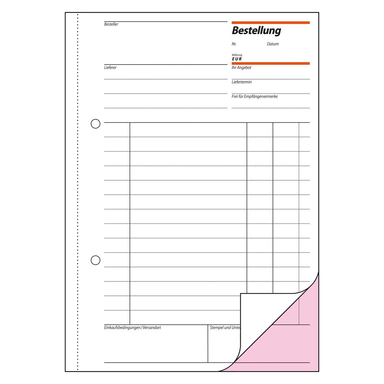 Bestellformular im Format DIN A5 mit 50 Originalen + 50 rosa Kopien, inklusive Blaupapier. FSC® zertifiziert, aktuell und rechtssicher. Alle Blätter mit Abheftlochung und ultrafeiner Microperforation für ein schnelles und sauberes Heraustrennen. Eine Sicherheitsbindung macht das Formularbuch besonders stabil und haltbar.