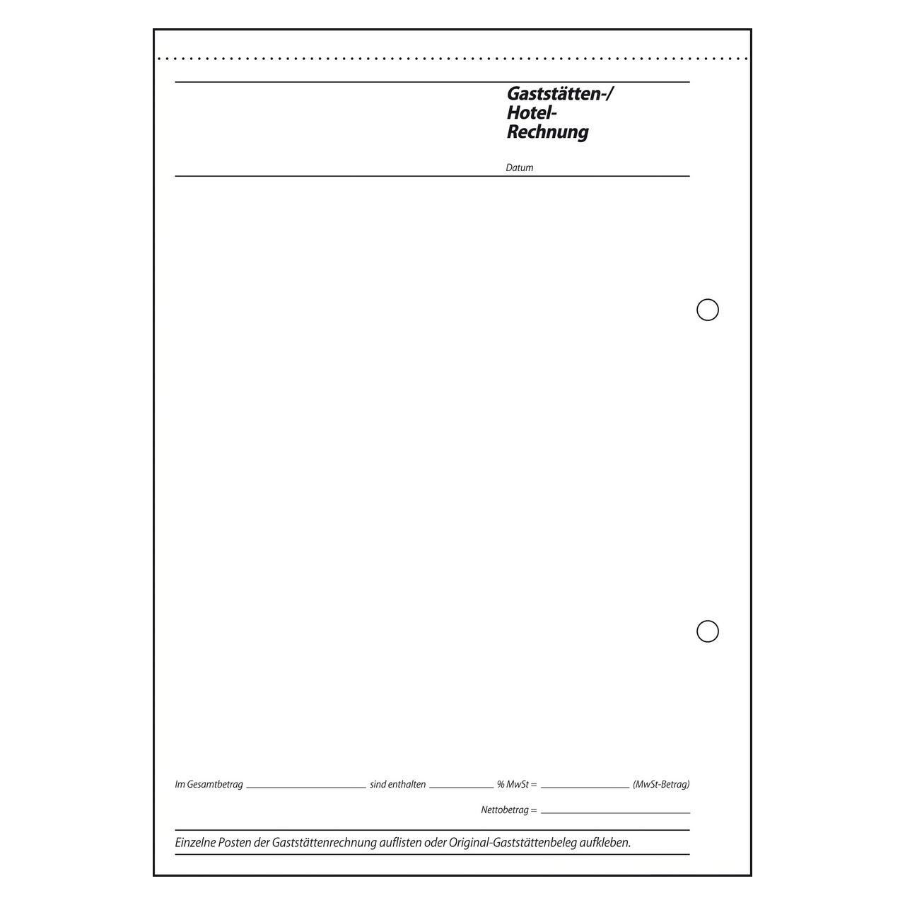 Bewirtungsspesennachweis/Gaststättenrechnung zum Nachweis betrieblich veranlaßter Bewirtungskosten. Abreißblock im Format DIN A5 mit 50 Blatt. FSC® zertifiziert, aktuell und rechtssicher, mit allen Angaben, die das Finanzamt für die Anerkennung fordert. Alle Blätter mit Abheftlochung und ultrafeiner Microperforation für ein schnelles und sauberes Heraustrennen. Die Bewirtungsrechnung kann auf der Rückseite aufgeklebt werden. Eine Sicherheitsbindung macht das Formularbuch besonders stabil und haltbar.