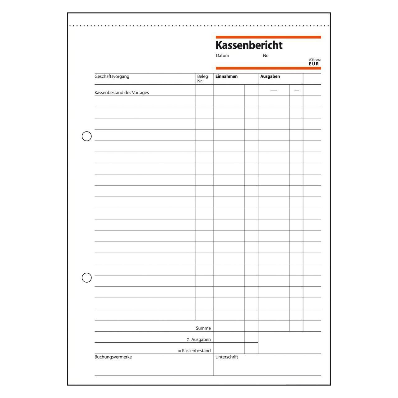 Kassenbericht mit Bestandsrechnung im Format DIN A5 mit 50 Blatt. FSC® zertifiziert, aktuell und rechtssicher, zur korrekten Ermittlung des Tagesabschlusses und des Kassenbestandes. Die Tabelleneinteilung eignet sich sowohl für Brutto- als auch für Nettoverbuchungen. Alle Blätter mit Abheftlochung und ultrafeiner Microperforation für ein schnelles und sauberes Herautrennen. Eine Sicherheitsbindung macht das Formularbuch besonders stabil und haltbar.