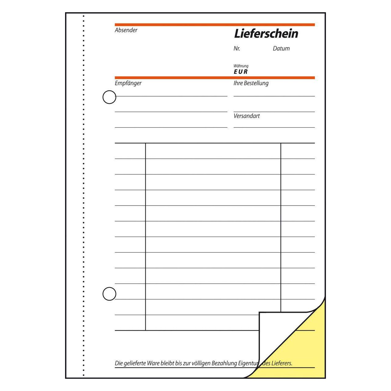 Selbstdurchschreibendes Lieferscheinbuch mit Empfangschein im Format DIN A6 mit 40 Originalen + 40 gelben Kopien, inklusive integrierter Schreibunterlage. FSC® zertifiziert, aktuell und rechtssicher. Alle Blätter sind mit Abheftlochung und ultrafeiner Microperforation für ein schnelles und sauberes Heraustrennen. Eine Sicherheitsbindung macht das Formularbuch besonders stabil und haltbar.