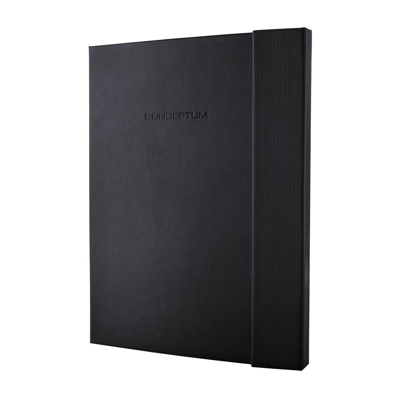 Schwarzes, kariertes Notizbuch CONCEPTUM®. Hardcover-Einband mit geriffelter Kunststoff-Oberfläche. Enthält 194 nummerierte Seiten, inklusive 20 perforierter Blätter zum Heraustrennen. Zu den Besonderheiten zählen Stiftschlaufe, Magnetverschluss, Inhaltsverzeichnis, Quickpocket, Archivtasche mit 2 Kartenfächern für je bis zu 10 Visitenkarten und 2 Zeichenbänder. Die Größe des Buches ist größer als DIN A4 - so können DIN A4-Blätter problemlos in das Buch eingelegt werden.