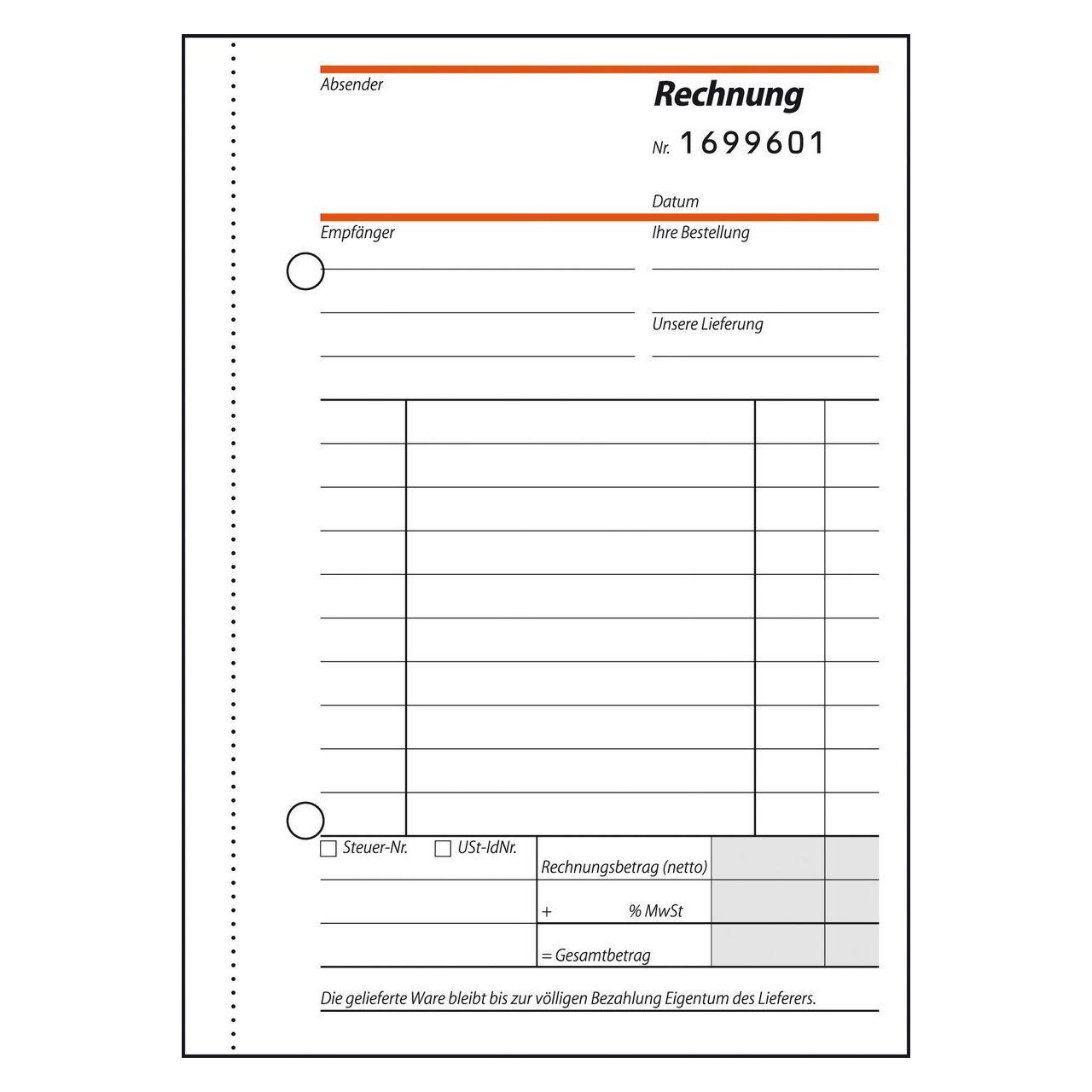 Selbstdurchschreibendes Rechnungsbuch im Format DIN A6 und vorgedruckter fortlaufender 7stelliger Nummer auf Original und Kopie zur eindeutigen Identifizierung. Inhalt mit 50 Originale + 50 gelbe Kopien, inklusive integrierter Schreibunterlage. FSC® zertifiziert, aktuell und rechtssicher mit allen erforderlichen Angaben wie z.B. IBAN/BIC, Steuernummer/USt-IdNr. und Rechnungsnummer. Alle Blätter mit Abheftlochung und ultrafeiner Microperforation für ein schnelles und sauberes Heraustrennen. Zusätzlich mit einer übersichtlichen Tabelle zum Eintragen aller ausgestellten Rechnungen. Eine Sicherheitsbindung macht das Formularbuch besonders stabil und haltbar.