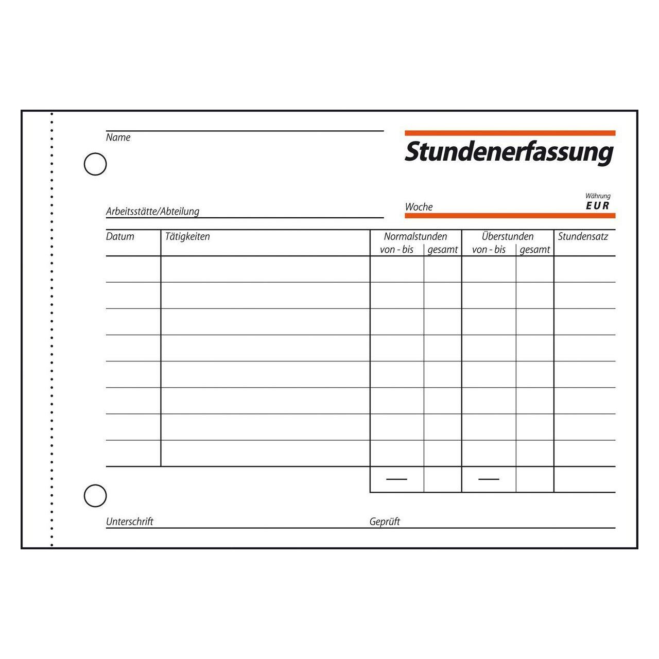 Stundenerfassungsbeleg im Format DIN A6 quer mit 50 Blatt, inklusive Blaupapier für die Erstellung eigener Kopien. FSC® zertifiziert, aktuell und rechtssicher. Das Formular dient der Erfassung von Arbeits- bzw. Überstunden, z.B. als Stundenbuch für "Mini-Jobs". Alle Blätter mit Abheftlochung und ultrafeiner Microperforation für ein schnelles und sauberes Abtrennen. Eine Sicherheitsbindung macht das Formularbuch besonders stabil und haltbar.