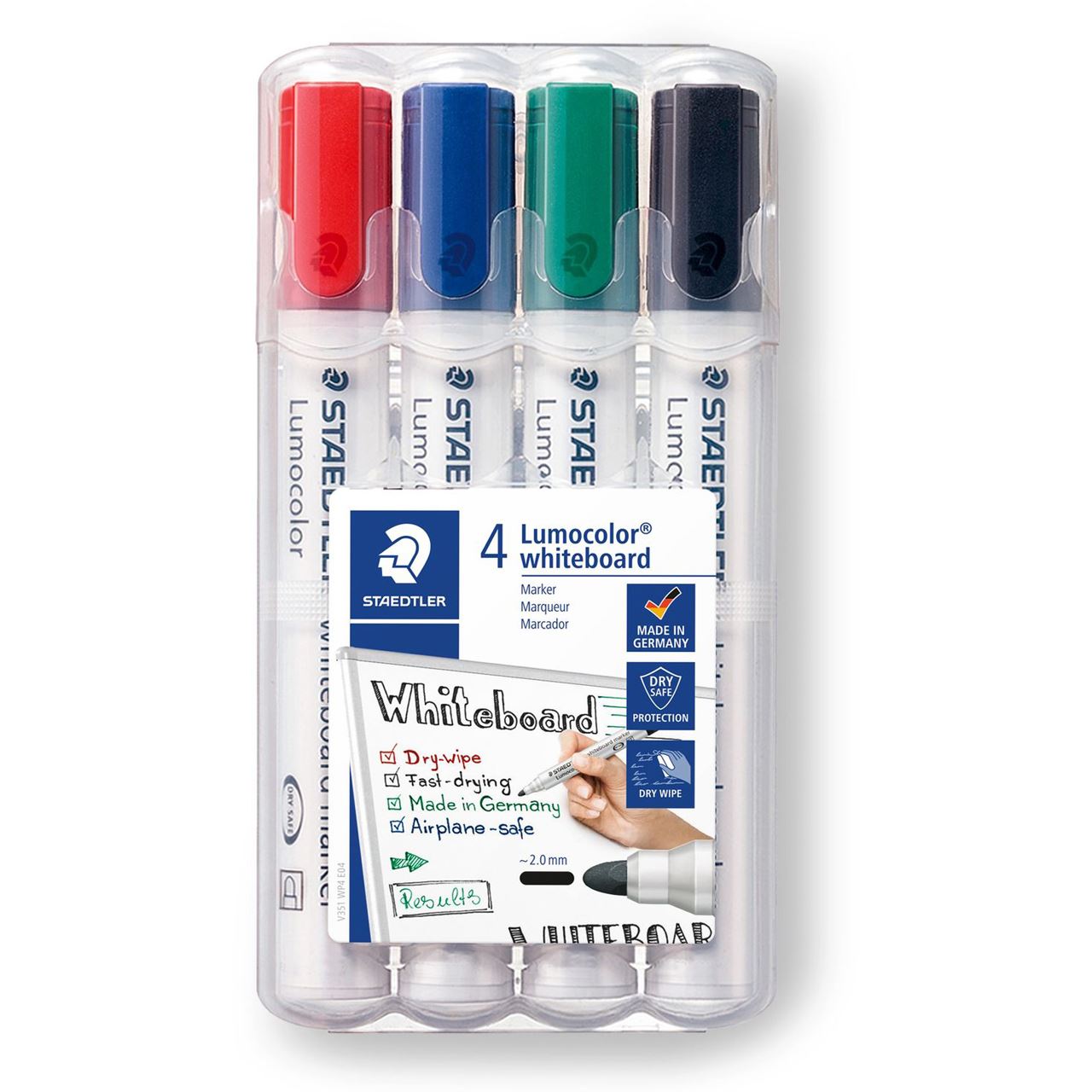 Strichstärke: 2,0 mm, Rundspitze, nachfüllbar, DRY SAFE, trocken abwischbar, blockierte Spitze, in sortiert in den schwarz, blau, rot, grün Inhalt: 4 Stück (351 WP4)