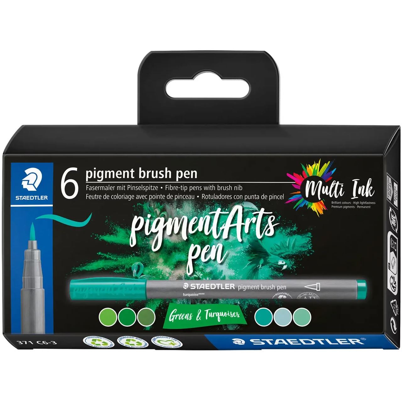 Staedtler Pigment Arts Brush Pen Greens & Turquoises. Anzahl der Farben: 6 Farben, Schreibfarben: Grün, Türkis, Gehäuseform: Rund. Menge pro Packung: 6 Stück(e), Verpackungsart: Karton mit Aufhänger