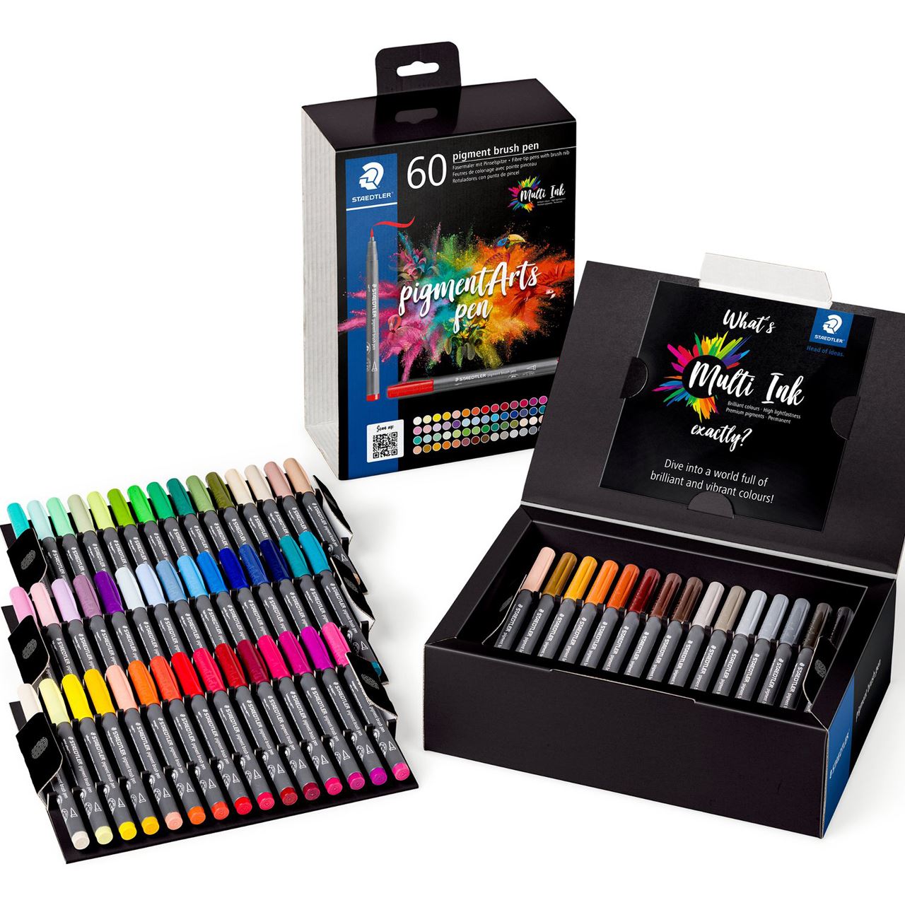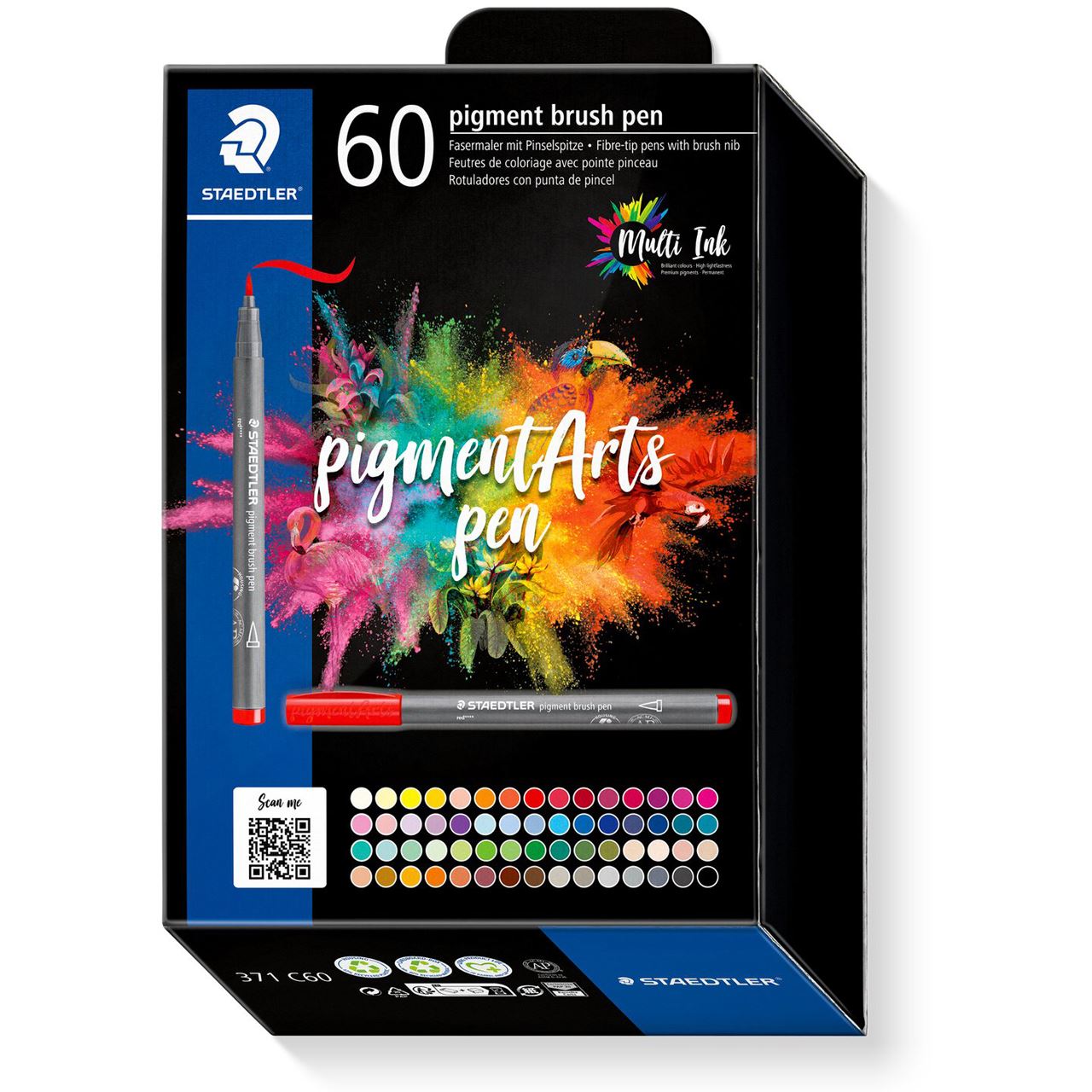 Staedtler Pigment Brush Pen 60er Schachtel. Anzahl der Farben: 60 Farben, Schreibfarben: Mehrfarbig, Typ der Spitze: Pinselspitze. Menge pro Packung: 60 Stück(e), Verpackungsart: Karton mit Aufhänger